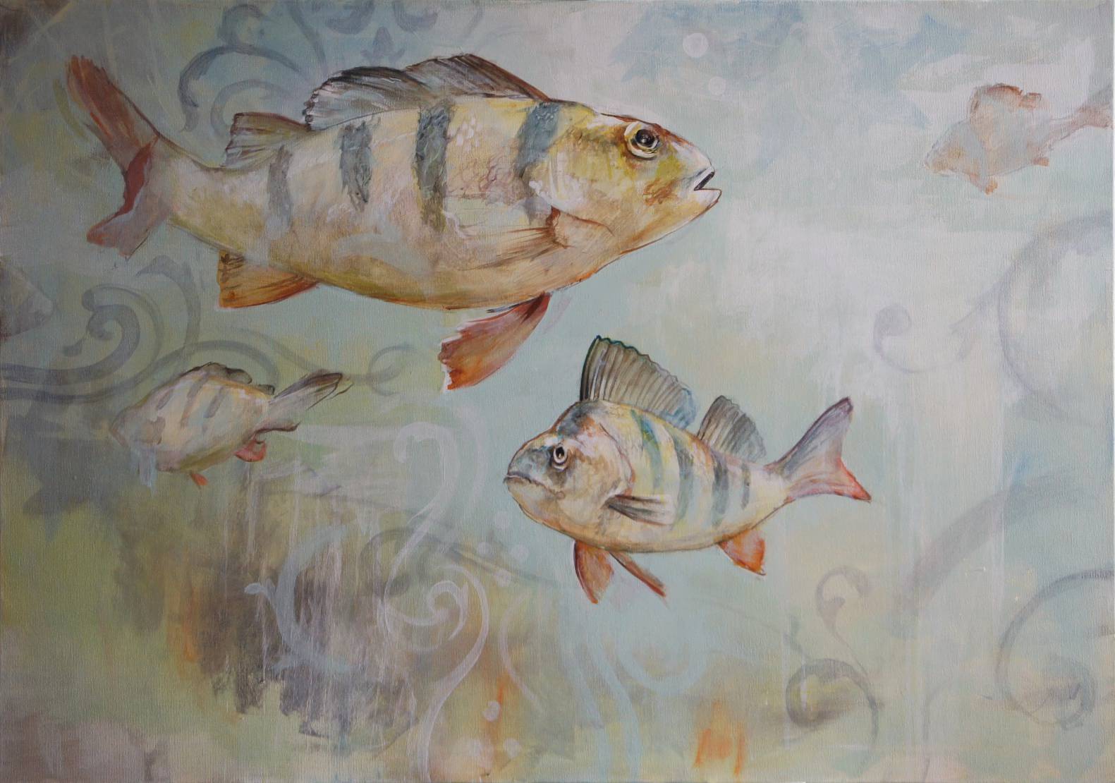 Na obrazie widzimy urocze rybki, zwinnie pływające w spokojnych wodach. Tło to delikatna gra cieni i pastelowych barw, gdzie dominują odcienie błękitu i zieleni. Światło delikatnie przenika przez wodę, tworząc subtelne refleksy. Rybki, wymalowane w odcieniach pomarańczu i żółci, przyciągają wzrok swoją żywą obecnością i dynamicznymi sylwetkami. Patrząc na nie, można niemal usłyszeć cichy szum wody. Kompozycja zdaje się płynąć, a ornamenty w tle wprowadzają do dzieła nutę tajemnicy. Styl jest lekki, impresjonistyczny, z wyraźnym podkreśleniem tekstury. Artysta wykorzystał techniki mieszania kolorów, co dodaje głębi i dynamizmu. Patrząc na obraz, czujemy spokój i harmonię, jakbyśmy zanurzyli się w innym świecie. A może nawet "wish to be a fish"! Nie mogę oderwać wzroku od tego dzieła. Daje mi to poczucie beztroski, przypomina mi czasy dzieciństwa. Myślę o letnich dniach nad jeziorem, kiedy świat wydawał się tak prosty i pełen cudów. Podziwiając te rybki, jestem przeniesiony do krainy marzeń i wspomnień.