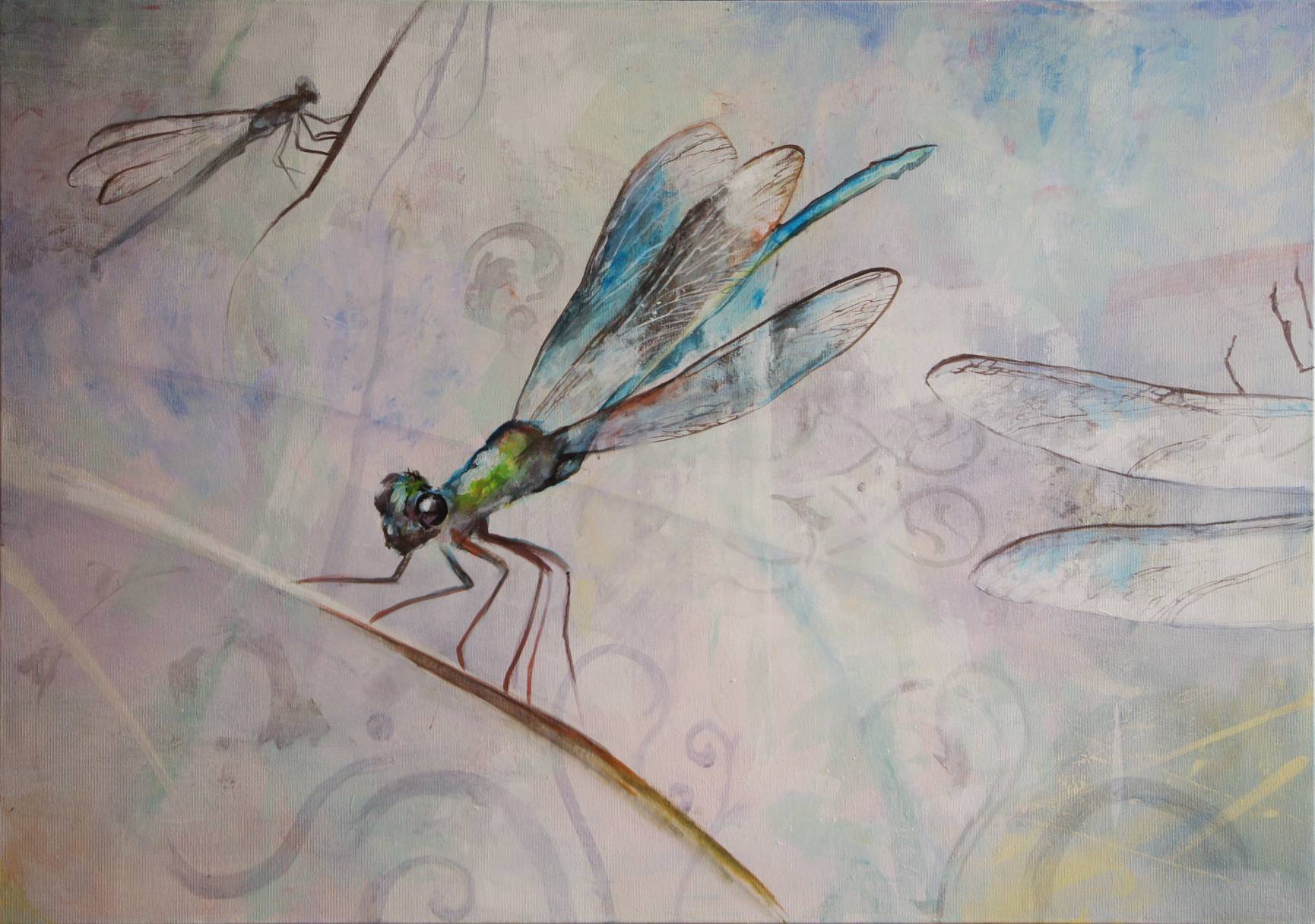 Obraz przedstawia ważkę w eterycznej atmosferze, zanurzoną w pastelowych tonach. Przejrzyste skrzydła mienią się odcieniami błękitu i zieleni, tworząc iluzję ruchu na tle delikatnych, rozmazanych linii. Subtelna, niemal efemeryczna kompozycja przyciąga wzrok, wprowadzając do niej elementy chaosu i spokoju jednocześnie. Można poczuć lekki powiew letniego wiatru. Technika malarska wydaje się być mieszanką akwareli i oleju, tworząc efekt miękkości i przejrzystości. Panuje tu atmosfera beztroski i harmonii. Jakby czas się zatrzymał, dając nam moment na przemyślenie tego, co ulotne i piękne w naturze. Dla mnie osobiście obraz ten budzi wrażenie beztroskiego popołudnia, spędzonego na łące. Artystyczny styl jest zdecydowanie oniryczny, prowokujący do marzeń. Użycie pastelowych barw daje poczucie spokoju. Jak mówi dziecko: "Ważka jest jak wróżka fruwająca po niebie!" Jedno słowo, które przychodzi na myśl, to "whimsical". Obraz ten jest jak marzenie zamknięte w ramie, ku pokrzepieniu duszy.