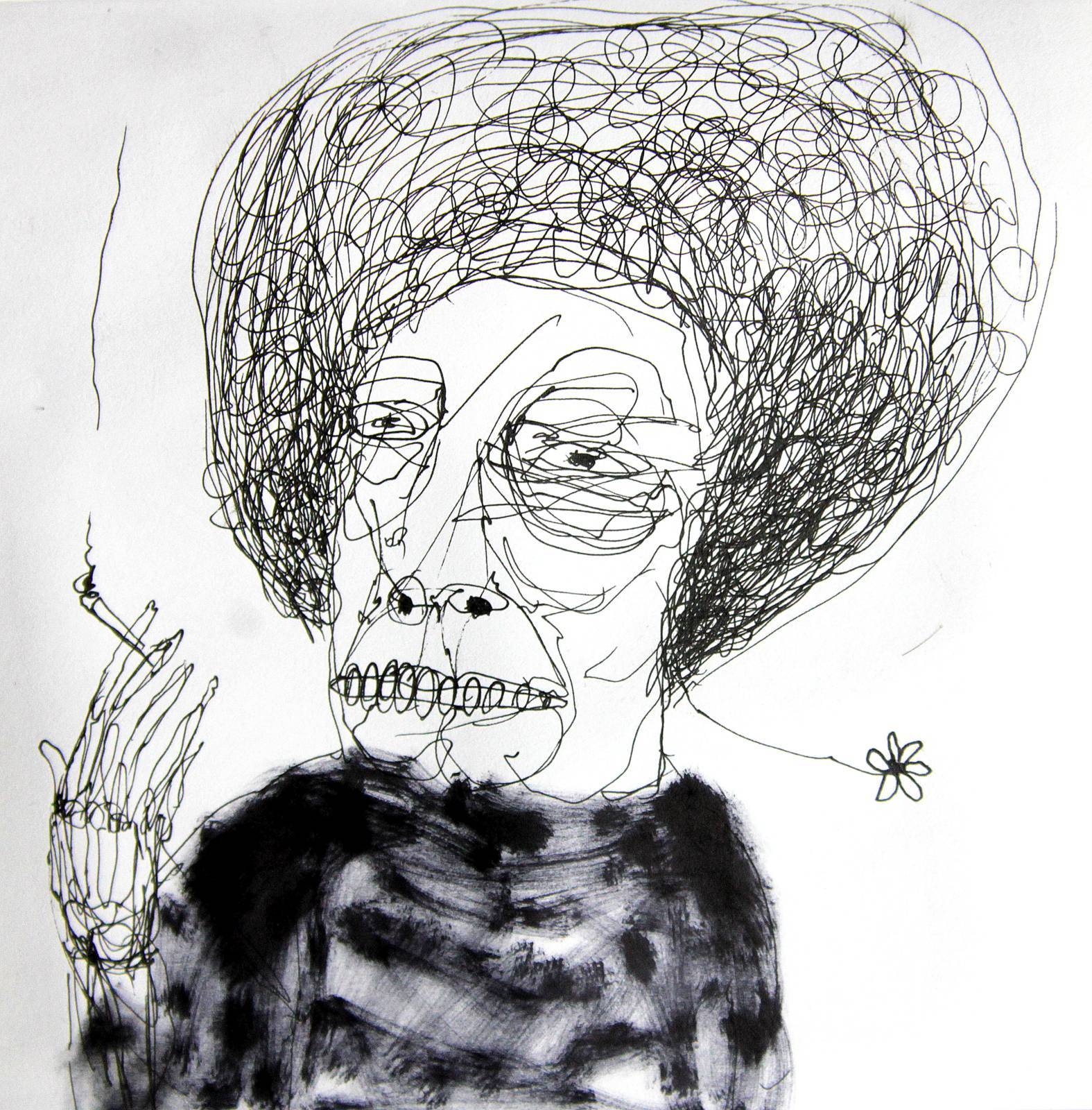 Obraz przyciąga wzrok swoją niekonwencjonalną kompozycją. Na białym tle dominuje postać stworzona z chaotycznych, wirujących linii, która zdaje się być zatopiona w głębokiej zadumie. Twarz jakby wyjęta z mglistych wspomnień, pełna krzywizn i zarysów, tworzy niezwykły portret. Artysta zastosował technikę luźnego szkicu, wydobywając z papieru niespokojny nastrój, który porusza odbiorcę. Czarne linie są żywiołowe, z fantazyjnym ruchem, tworząc włosy podobne do gęstego puszystej chmury. I taka dziwna buźka, jak z bajki. Atmosfera tego dzieła jest pełna tajemnicy i melancholii. To taka mieszanka niepokoju i jakiegoś dziwnego spokoju, która sprawia, że chce się patrzeć dłużej. Styl przypomina kreskówkowy chaos, gdzie everything seems to move and dance. Postać, choć stworzona z luźnych kresek, wyraża emocje w sposób subtelny, a jednocześnie mocno oddziałujący na wyobraźnię. Dym papierosa delikatnie unosi się do góry, dodając jego splątanym liniom jeszcze więcej dynamizmu. Obraz mówi o swoim odbiorcy tyle, ile ten jest gotów z niego wyczytać. Można poczuć, że postać coś ukrywa, jakieś tajemnice życia, może trochę smutku. Jakby artysta bawił się w odgadywanie ludzkiej duszy przez misternie poplątane linie i plamy tuszu.