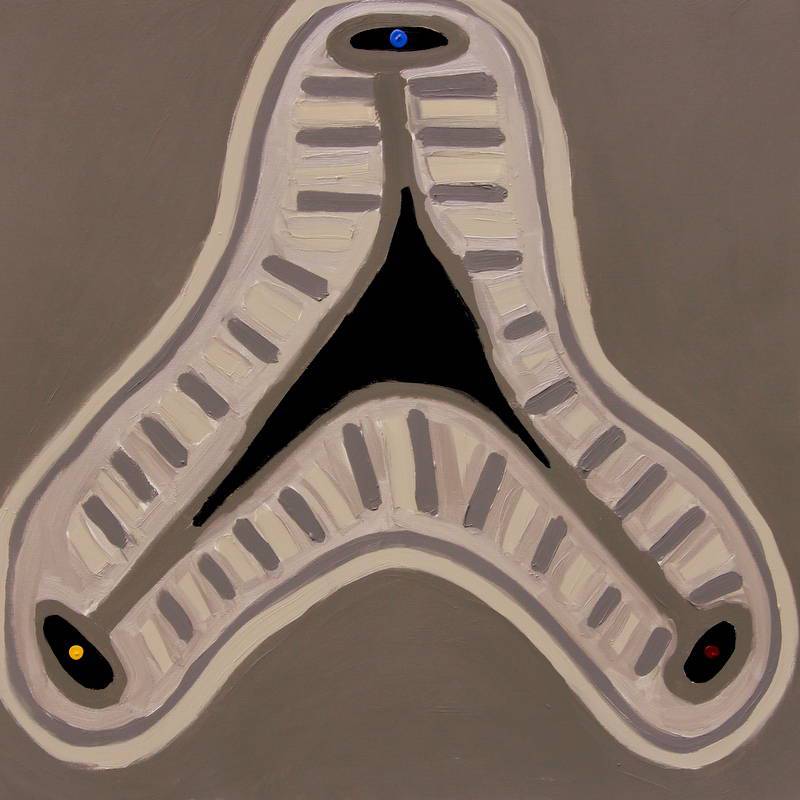 Na obrazie dominuje abstrakcyjna forma przypominająca literę "Y". Uwagę przyciąga kontrast pomiędzy szarym tłem a jasną strukturą centralną, podzieloną na segmenty. Na końcach każdej odnogi widoczne są kolorowe kropki: niebieska, czerwona i żółta - jakby przypadkowe, ale przecież tak starannie rozmieszczone. Całość tworzy wrażenie ruchu, jakby coś się przesuwało lub falowało. Atmosfera tego dzieła jest intrygująca i tajemnicza. Można poczuć się jak mały detektyw starający się rozwikłać zagadkę. Kolory są stonowane, co nadaje całości spokojny, ale jednocześnie niepokojący nastrój. To trochę jak spacer po opustoszałym mieście w szary dzień, gdzie każde skrzyżowanie skrywa sekret. Styl artysty jest zdecydowanie abstrakcyjny z nutką minimalizmu. Użyte techniki malarskie, choć pozornie proste, wykazują dużą precyzję i wyczucie kompozycji. Obraz przypomina nieco doodle, jakby ktoś machnął ręką free-stylem, a potem z powagą twierdził, że to było zaplanowane. Jakie emocje wywołuje ten obraz? Na mnie działa uspokajająco, ale też pobudza wyobraźnię. Może to droga do nieznanego świata, albo tajemna mapa kosmosu. A może to po prostu dziecinnie prosta gra planszowa, którą stworzył artysta-zabawkarz. Mamo, ta ścieżka wygląda jak zygzakowaty wąż! Taki obraz może fascynować, wpływając na odbiorcę niczym zagadkowy labirynt prowadzący do niespodzianki. To coś więcej niż "just art" - to przygoda dla ducha i oczu.