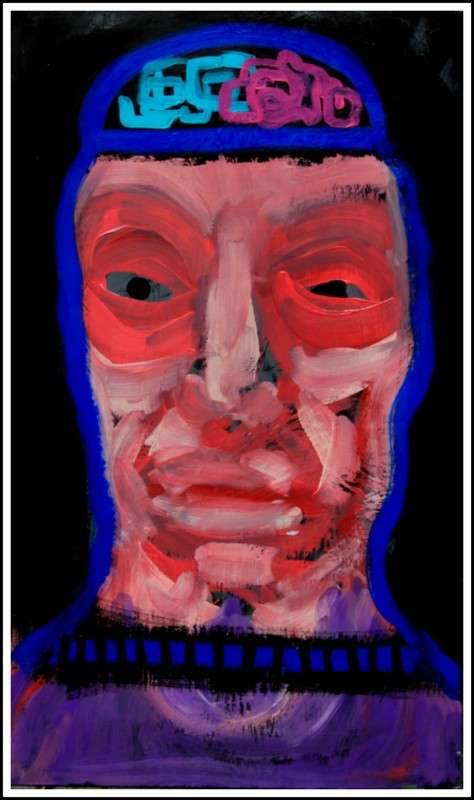 Na obrazie widzimy twarz w nasyconych czerwieniach, otoczoną intensywną, niebieską poświatą. Barwy są żywe, kontrastowe, a tło głębokie, czarne, co dodaje głębi całej kompozycji. Twarz jest zgeometryzowana, jakby malowana grubymi pociągnięciami pędzla, co daje dynamiczny efekt. Kształty są nieregularne, ale harmonijnie splecione. Atmosfera obrazu jest trochę tajemnicza, może nawet nieco niepokojąca. Wyczuwalna jest energia artysty, który wybrał odważne, swobodne pociągnięcia pędzla, takie jak w stylu ekspresjonistycznym. Obraz może budzić różne emocje. Dla jednych będzie to fascynacja kolorem i formą, dla innych refleksja nad ludzką naturą. Przywodzi na myśl pytania o to, co kryje się za maską codzienności. Spoglądanie na twarz, która wydaje się patrzeć w głąb nas, budzi dreszczyk emocji. To jak gra w „czy widzisz to, co ja widzę?” Chociaż malarski styl jest odważny, nie jest pozbawiony finezji. Jeden element wyróżnia się szczególnie – napis na górze w jaskrawych odcieniach, przypominający graffiti. "Cool", pomyśli się, patrząc na ten detal. Obraz emanuje mieszanką chaosu i harmonii. Myślę, że to praca, do której można wracać, za każdym razem odkrywając coś nowego. Jest hipnotyzujący.eneralnie to super obrazek, taki prawie magiczny.