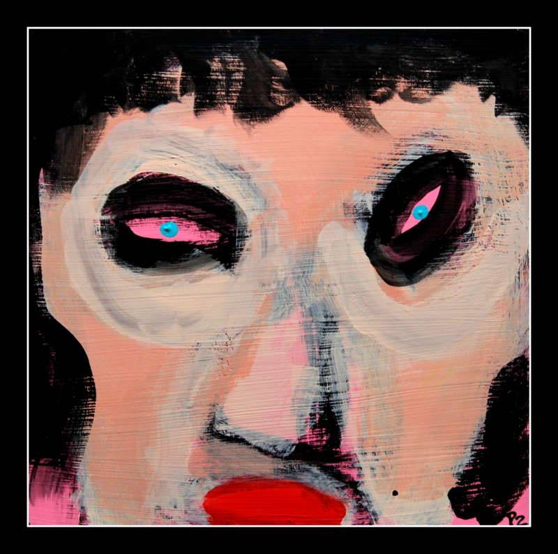 Na obrazie dominuje intensywny kontrast między czernią a jasnymi odcieniami bieli i różu. Twarz, z dużymi, ciekawie rozmazanymi oczami, zdaje się patrzeć prosto na widza. Trudno oderwać wzrok od tych jasnobłękitnych punkcików pośród ciemnych obramowań. Kompozycja jest przepojona chaosem, a zarazem pewnym rodzajem harmonii, tworząc dynamiczną całość. Technika swobodnych pociągnięć pędzla nadaje obrazowi ekspresyjny charakter. Atmosfera jest nieco niepokojąca, tajemnicza, może nawet creepy. Styl artystyczny ociera się o ekspresjonizm, z domieszką surowego, niemal prymitywnego podejścia. Artysta z przekorą igra z formą i kolorem, tworząc dzieło na pograniczu rzeczywistości i snu. A może to koszmar? Obraz wywołuje emocje. Z jednej strony fascynację, z drugiej – lekki niepokój. Przypomina mi mimiczne maski klauna, te z cyrkowego snu. Dla dziecka to może być "ten, co ma oczy jak kameleony i śpi". Chłonąc to dzieło, czujemy nagły impuls, by zacząć kwestionować własne postrzeganie świata. Pojawia się pytanie: co artysta naprawdę miał na myśli? Ale wszystko tutaj jest "open to interpretation". To dzieło żyje, oddycha, szepcze i krzyczy jednocześnie! Wciągające i inspirujące dla wszystkich z otwartym umysłem.