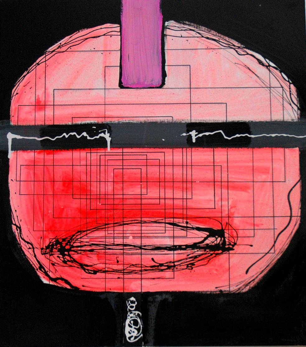 Na obrazie dominuje intensywny róż, przetykany czernią, który tworzy zaskakującą kompozycję. Prostokątne kształty poprzecinane są czarnymi liniami, przypominającymi geometryczną mapę myśli lub labirynt. Na pierwszy rzut oka to jakby twarz, choć każdy widzi coś innego. Atmosfera dzieła jest nieco mroczna, lecz intrygująca, zasiewając w widzu ziarenko niepokoju, ale też ciekawości. Wygląda to jak połączenie chaosu i porządku w jednym. Artysta zastosował techniki spray painting i linearne kreski, co nadaje obrazowi nowoczesny, trochę nawet elektroniczny look. Można poczuć, jakby obraz opowiadał o rozdarciu między emocjami, a racjonalnością. A co myśli 7-letnie dziecko? To taki śmieszny różowy balonik z noskiem! I te kolory – żywy róż i agresywna czerń zaraz przyciągają wzrok. Całość wywołuje emocje podobne do uczucia, gdy ogląda się abstrakcyjny film sci-fi. A może to rozmowa? Między sercem a umysłem? Sam już nie wiem, ale coś tam drga w duszy. Meglio rozedrgać, niż zastygnąć w stagnacji. Jestem pewien, że ten obraz długo pozostanie w pamięci, wywołując refleksję za każdym razem, gdy na niego spojrzę.