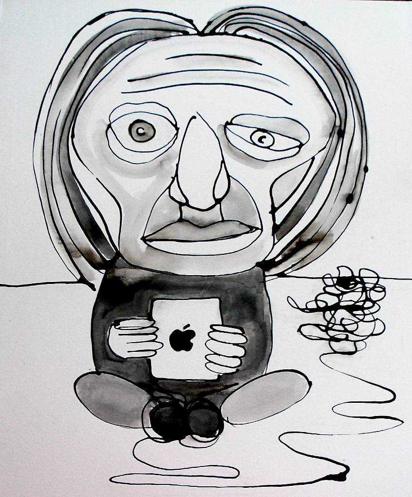 Na obrazie widzimy postać o nieco karykaturalnym wyrazie twarzy. Dominują kolory czarno-białe, co dodaje pracy pewnej surowości i nostalgii. Prosty, ale wyrazisty styl artystyczny przyciąga wzrok na centralną postać. Zabawnie nieproporcjonalne rysy twarzy i duże oczy sprawiają wrażenie zagubienia lub kontemplacji. W rękach trzyma urządzenie z charakterystycznym logo jabłka, co może symbolizować współczesne obsesje technologiczne. To wszystko siedzi. Liniowe, płynne kreski oraz mocne kontury podkreślają skomplikowaną osobowość postaci. Artysta bawi się tu formą, co sprawia, że dzieło wydaje się dynamiczne mimo statycznej pozy. Atmosfera obrazu jest dziwna. Z jednej strony jest humorystycznie, a z drugiej wywołuje pewne poczucie pustki. Czyżby to była refleksja nad samotnością w świecie pełnym technologii? Widoczna obok postaci plątanina kresek może byc interpretowana jako chaos myśli lub nieustanne rozpraszanie uwagi. Patrząc na ten obraz czuję coś. Może to lekkie rozżalenie nad iluzorycznym światem realnych przyjemności, które zaginęły w błysku ekranu. A może tylko śmieszy mnie ten dziwny człowiek z wielką głową i I love his big bubble-eyed stare. Podoba mi się, jak artysta nie boi się przesady. Jest tu też coś dziecięcego, przypominającego niedbałą ale szczery rysunkową kreację dziecka.