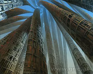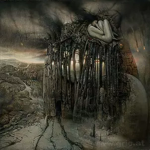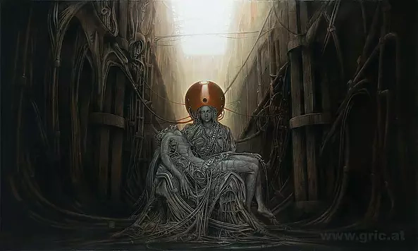 Ten obraz to prawdziwa mieszanka tajemniczości i futurystycznej wizji. Dominują ciemne, ziemiste kolory, przetykane delikatnym blaskiem. Postać w centrum, z ogromnym, pomarańczowym hełmem, otoczona jest plątaniną kabli i dziwnych form, tworząc mieszankę organicznych i mechanicznych kształtów. Tło, ciemne i klaustrofobiczne, sprawia wrażenie industrialnego korytarza. Jestem ciekaw, co siedmiolatka pomyśli – może to miasto dla robotów? Atmosfera obrazu jest nieco przytłaczająca, jakbyśmy weszli w świat sci-fi pełen zagadek. Artysta użył technik realistycznych, dodając elementy surrealistyczne, które intrygują i niepokoją jednocześnie. Patrzysz na to i czujesz dreszczyk, a maybe nawet nutkę niepewności, co dalej się wydarzy. To działa jak magnes, przyciąga i nie puszcza. Emocje? Oj, można by o nich pisać i pisać. Widzisz postać przywodzącą na myśl ikonę współczesnego Pietà, wzbudzająca uczucie smutku i izolacji. Całość zachęca do refleksji nad relacją człowieka z technologią, być może zachęcając do twórczej zadumy nad przyszłością. Obraz nie pyta, on krzyczy do naszej wyobraźni, zmuszając do zastanowienia się, gdzie my, jako ludzkość, zmierzamy.