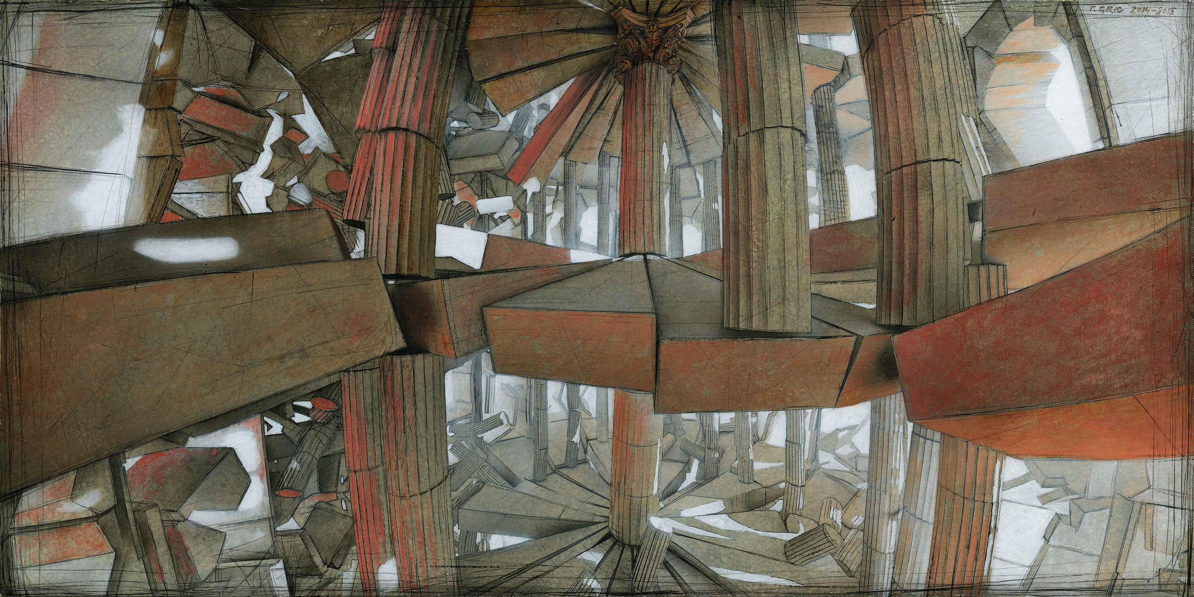 Obraz przedstawia labirynt abstrakcyjnych form przypominających kolumny, w odcieniach rdzawej czerwieni, szarości i czerni. Fragmenty architektoniczne zdają się unosić lub przechylać w przestrzeni, tworząc niezwykły, chaotyczny, ale fascynujący świat. Kompozycja wydaje się być zamknięta w swoistym, geometrycznym tańcu, który sprawia wrażenie wiecznego ruchu. Elementy te przypominają mi starożytne ruiny, które rozpadły się i teraz unoszą się w tajemniczym zawieszeniu. Obraz emanuje nastrojem tajemniczości, wpływając na widza, jakby wciągał go do świata snów i wyobraźni. Styl obrazu jest surowy i dynamiczny, użyte techniki wskazują na pewną brutalność, ale i delikatność w sposobie, w jaki artysta uchwycił światło i cienie. Te nieposkromione kolory mają w sobie coś z game of "light and shadow" – gra cieni i światła dodaje dziełu niesamowitej głębi. Patrząc na to dzieło, można poczuć się zagubionym, ale jednocześnie zafascynowanym. Jakby poszukiwało się ukrytej symetrii w tym, co na pierwszy rzut oka wygląda na chaos. Może mały Jaś, patrząc na obraz, powiedziałby: "To wygląda jak zamek z Lego!" I mimo tej dziecięcej prostoty, coś w tym jest – obrazuje on złożoność i chaos, jak i dziecięcą zabawę formami. Dla mnie to przypomina marzenia, w których wszystko jest jednocześnie realne i nierealne. Obraz ten może budzić w widzu różnorodne emocje – od zachwytu po niepokój.