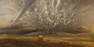 Obraz ukazuje monumentalną budowlę wkomponowaną w surowy krajobraz, gdzie dominują odcienie zieleni, szarości i błękitu. Zielony mech porasta skalne zbocza niczym miękki dywan, kontrastując z monumentalną architekturą w tle. Budowla, przypominająca starożytne ruiny, wznosi się dumnie, a nad nią płynie delikatny, pofalowany jak fale ocean zabawny układ chmur, dodających całej scenerii dynamiki. Obraz emanuje spokojem, ale i tajemniczością, jakby zaraz miał się wydarzyć jakiś secret. Styl artysty jest realistyczny, ale z nutką oniryzmu, co przyciąga wzrok i skłania do zadumy. Technika malarska jest mistrzowsko opanowana, faktura skał i gry światła są oddane z niezwykłą precyzją. Można odnieść wrażenie, że czas na chwilę zatrzymał się w tym magicznym miejscu. Dla odbiorcy obraz może wywoływać skojarzenia z podróżą w nieznane lub powrotem do zapomnianych światów. To przypomina trochę jak bajka z dzieciństwa, tylko że na poważnie. A teraz moja osobista refleksja: gdy patrzę na ten obraz, czuję się jak odkrywca w surowym świecie, pełnym niezbadanych tajemnic. Wow, how amazing, prawda? Świat przedstawiony jest pełen spokoju, ale i zaprasza do przygody w głąb samego siebie.