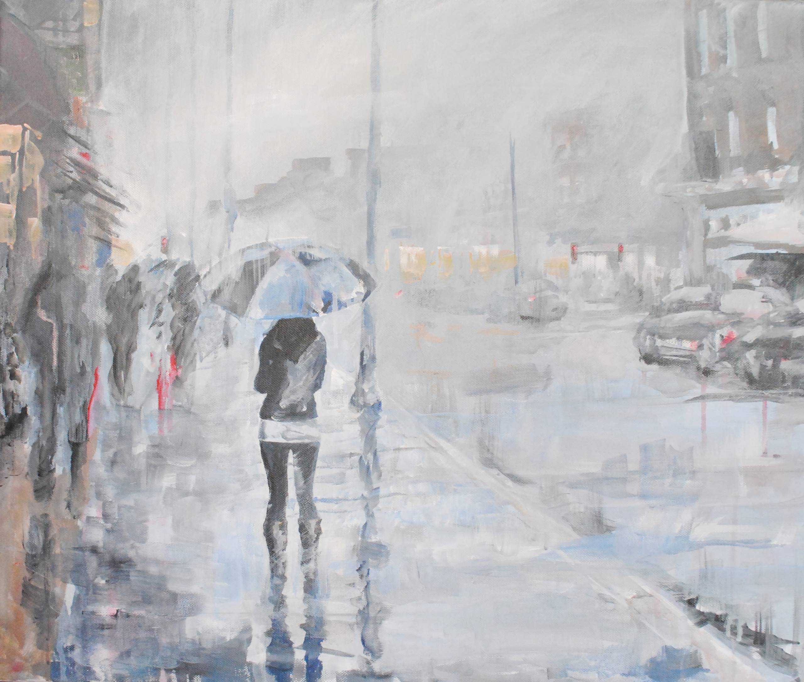 Acrylic on canvas of girl waiting in the rain on Queensway London