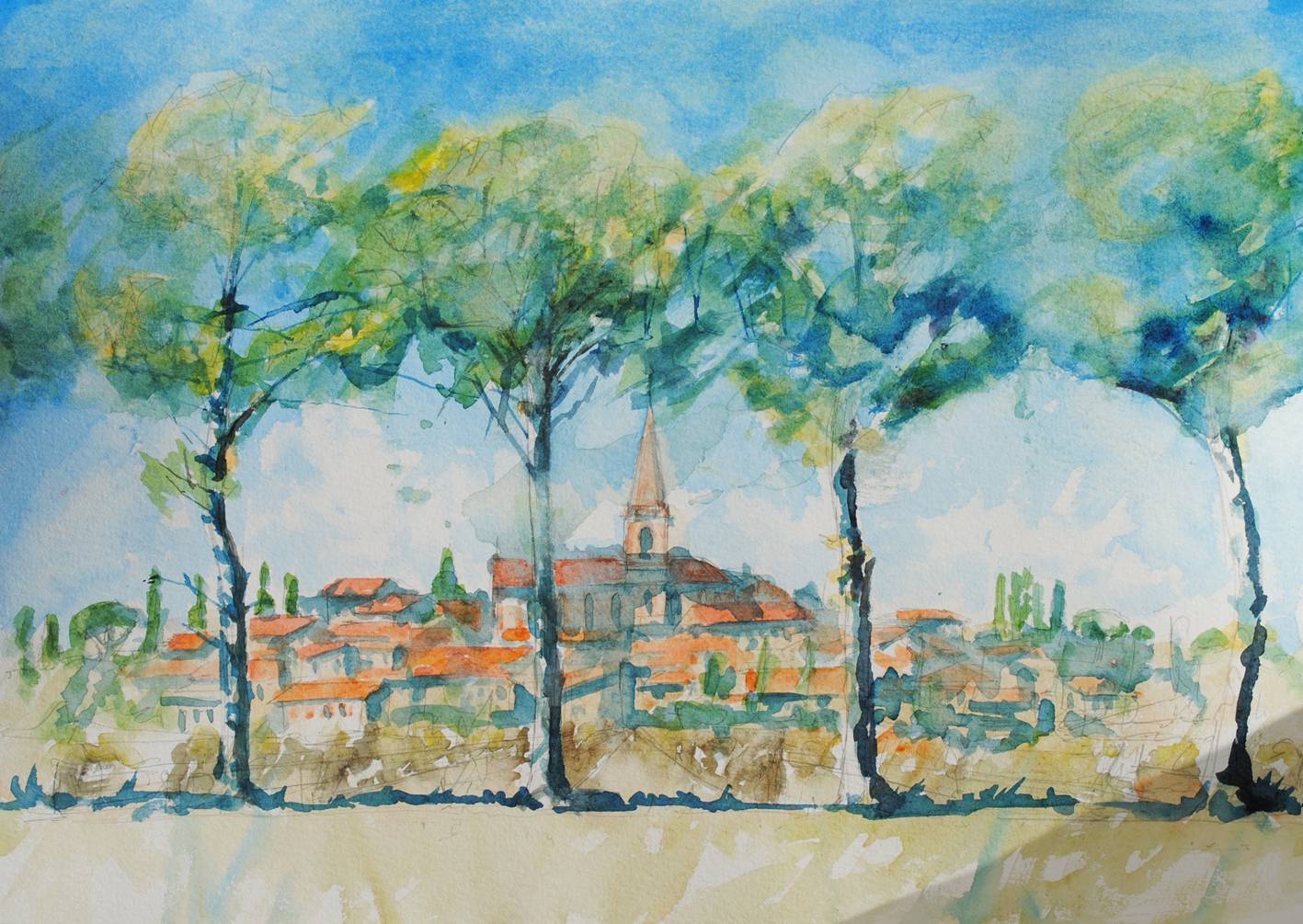 Watercolour on paper. An impression of a small town lying in sunshine in the southern french countryside ... close to Toulouse