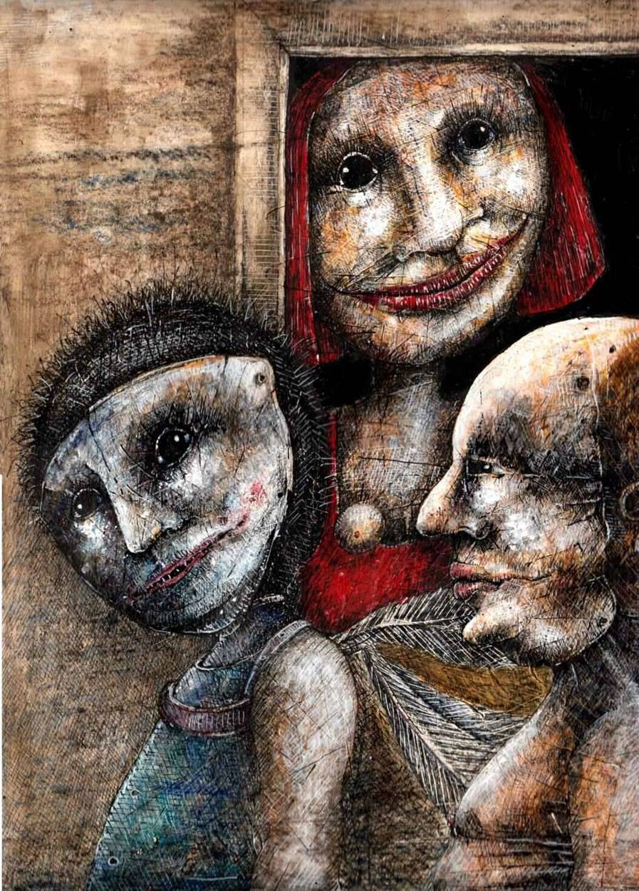 Na obrazie dominują postacie o nietypowych, wręcz groteskowych twarzach. Kolory są przygaszone, dominują brązy, szarości i subtelne czerwienie. Kompozycja zdaje się być dynamiczna, z postaciami wychylającymi się z różnych stron. Atmosfera obrazu jest nieco niepokojąca, jakbyśmy wpadli w świat snu lub koszmaru. Styl jest bardzo ekspresyjny z mocno zarysowanymi liniami. Artysta zastosował techniki nadające powierzchni obrazu fakturę, która sprawia, że wydaje się trójwymiarowa. Obraz może budzić w odbiorcy różne emocje. Z jednej strony fascynację, z drugiej niepokój. Może ktoś pomyśli: "Czemu oni tacy dziwni?". Dzieciak powiedziałby po prostu: "Ale dziwne ludziki!". Użycie wspomnianych technik powoduje, że dzieło przykuwa wzrok na dłużej i zmusza do refleksji. Trudno oderwać wzrok, bo jest tak tajemniczo. Osobiście, czuję coś jak deja vu, jakbym już kiedyś to widział, tylko nie wiem gdzie. Gdy patrzę, zastanawiam się nad ukrytymi znaczeniami. To trochę jak "adventure" w nieznane, ale niesamowite. Naprawdę nie jestem pewien, co twórca miał na myśli, ale może właśnie o to chodzi — o wywołanie reakcji, emocji, zatrzymanie się na chwilę. Emocje i koncepcje unoszą się w powietrzu, pozostawiając pole dla wyobraźni.