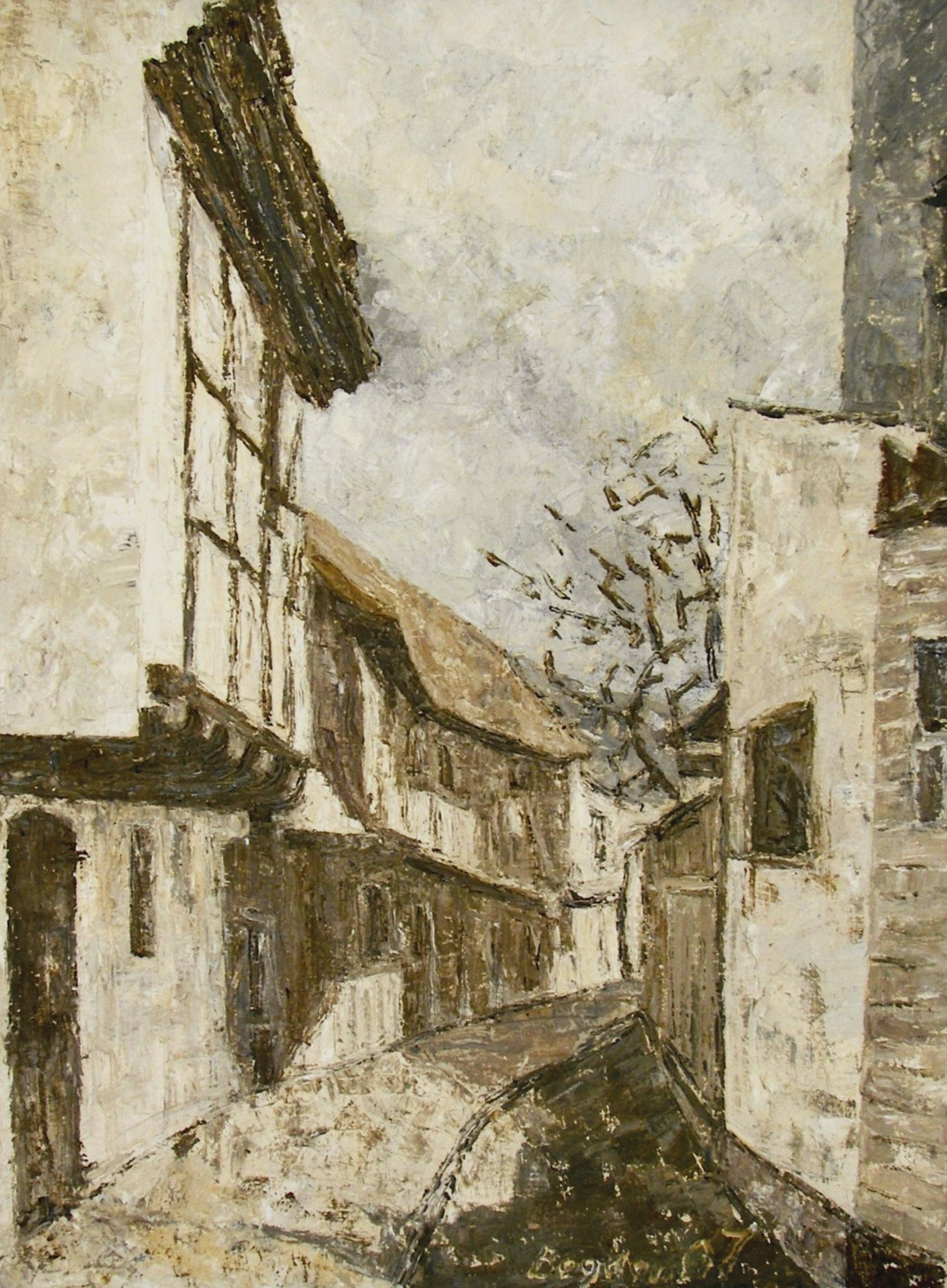 Na obrazie widzimy wąską, krętą uliczkę w starym mieście, pełną uroku i tajemnicy. Dominują tu stonowane odcienie brązu, beżu i szarości, które nadają dziełu spokojny, nieco melancholijny charakter. Budynki z prawej i lewej strony zdają się niemal pochylać nad przechodniem, jakby chciały go schronić przed światem. Malutkie okienka i nieregularne kontury dachów przyciągają wzrok, wprowadzając widza w nostalgiczny nastrój. Artysta zastosował technikę impastową, kładąc farbę grubą warstwą, co dodaje tekstury i głębi. Pociągnięcia pędzla są wyraźne, niosąc ze sobą emocje i subiektywne odczuwanie świata. Ten styl malarski to jakby whisper z przeszłości, przenoszący nas w inny czas i miejsce. Czujemy się jak w opowieści z książki, w której każdy zakręt uliczki skrywa nową tajemnicę. Dla małego dziecka to może być po prostu magiczna uliczka z bajki! Patrząc na obraz, czuję spokój, ale i ciekawość - co kryje się za rogiem? Może stare książki albo ciepła herbata czeka. Ta kompozycja zapada w pamięć, niczym wizja miejsca, które chcielibyśmy odwiedzić. Prosty, a jednocześnie pełen historii kadłubek miejskiego krajobrazu, który zostawia widza z własnymi myślami.