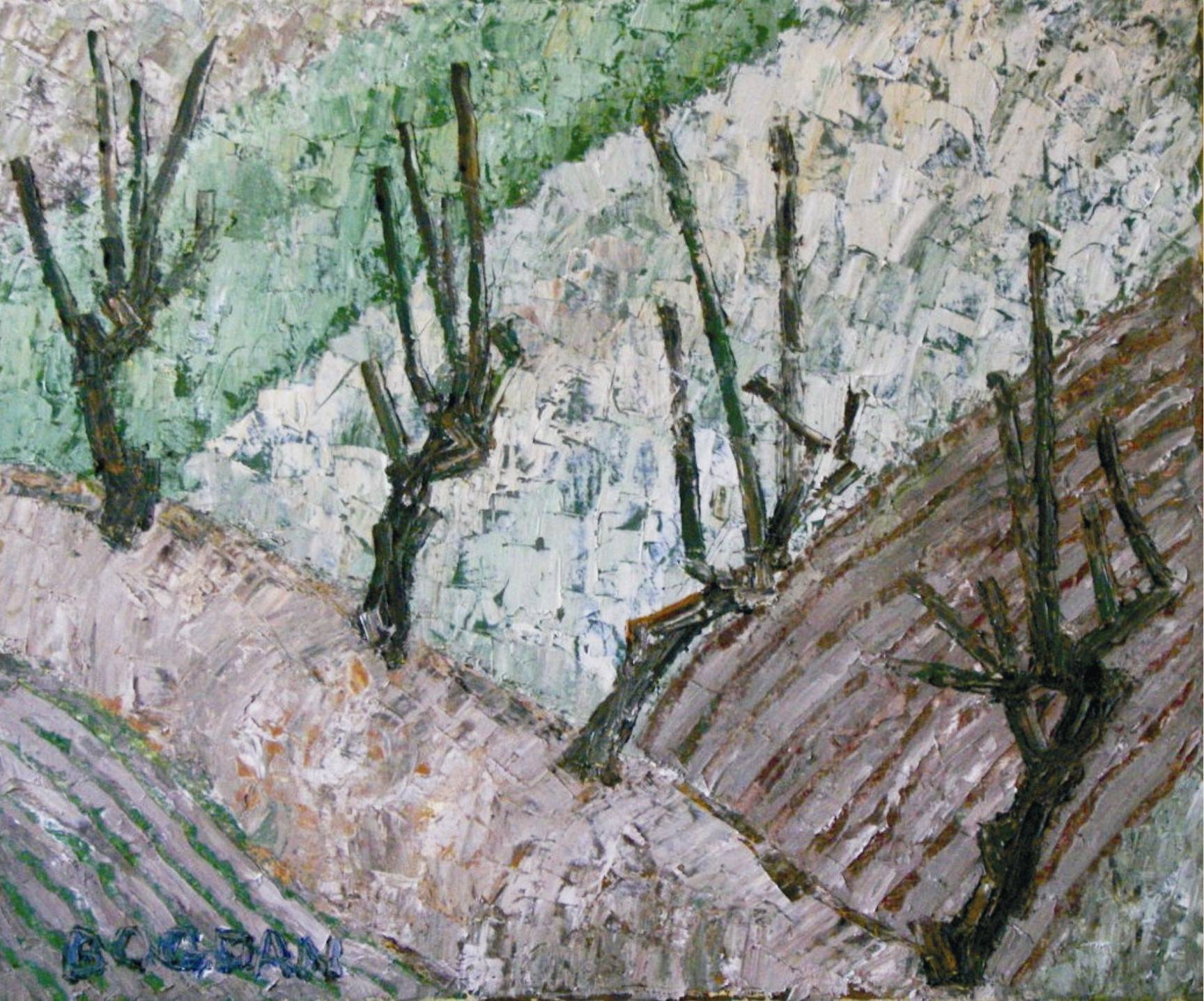 Obraz emanuje spokojem. Szaro-zielone odcienie dominują w pejzażu, tworząc nastrój późnej jesieni lub wczesnej wiosny. Gałęzie drzew, które przypominają zgniecione linie, wyrastają z ziemi, tworząc ciekawe sylwetki. Kompozycja jest jednocześnie dynamiczna i statyczna – jakby czas stanął w miejscu. Artysta posłużył się techniką impasto, gdzie grubo nałożone farby tworzą fakturę, którą prawie można dotknąć. Ta technika dodaje głębi i charakteru. A teraz trochę bajki! Te drzewka są jak marzenia niedźwiadków, które zimą się snują, czekając na wiosnę. Krzyżujące się linie gałęzi sugerują ruch, a zarazem bezruch. Trochę jak sztuka klimatyczna – „earthy”, jak to mówią. Obraz może wzbudzać różne emocje – melancholię, ale też nadzieję na nowe początki. Dla mnie osobiście, ten obraz jest jak chwila refleksji nad przemijającym czasem. Zastanawiam się, jakie historie te drzewa mogłyby opowiedzieć. Prawie słyszę ich opowieści, szum gałęzi w wietrze. Trochę jak szept, który przechodzi mi przez plecy.