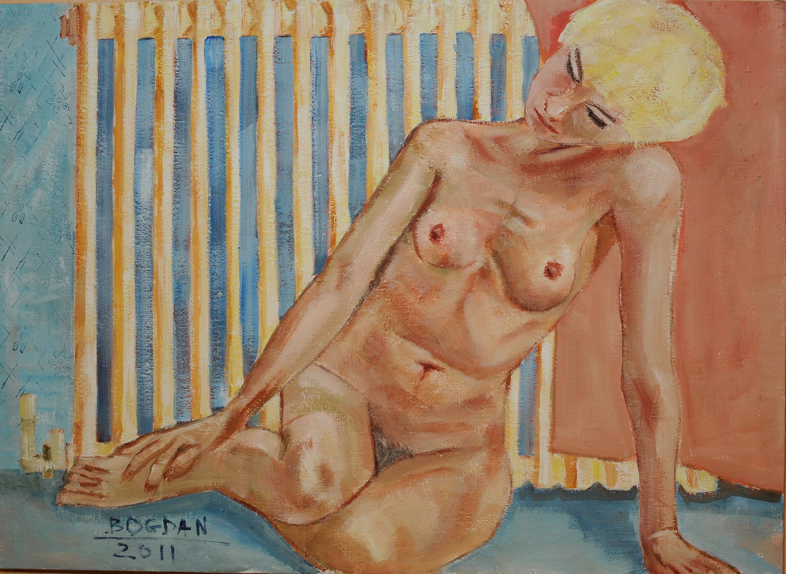 Obraz przedstawia nagą kobietę o blond włosach, siedzącą na tle grzejnika. Jasne, ciepłe barwy beżu i pomarańczu kontrastują z chłodnym niebieskim tłem, nadając dziełu harmonijnego, ale jednocześnie dynamicznego charakteru. Zaskakująca jest prostota kompozycji, która przyciąga wzrok swoim minimalizmem. Postawa kobiety, lekko pochylona, sprawia, że obraz emanuje spokojem i kontemplacją. To tak jakby czas się zatrzymał, a widz mógł zastanowić się nad chwilą. Kobieta wygląda na bardzo spokojną, choć jej pozę można by określić jako introspektywną. Technika artystyczna charakteryzuje się miękkimi pociągnięciami pędzla, co przywodzi na myśl impresjonizm, choć z domieszką surowości, typowego dla stylu modernistycznego. Artysta oddał subtelność ciała ludzkiego z dbałością o szczegóły, a jednocześnie uchwycił coś więcej - może echo emocji, nieuchwytne tchnienie indywidualizmu. Klimat obrazu jest somehow melancholijny, ale jednocześnie pełen ciepła, jakby artysta chciał powiedzieć, że w prostocie tkwi piękno. Dla dziecka, ten obraz mógłby być opowieścią o kimś, kto odpoczywa po długim dniu. "Ta pani siedzi, bo się zmęczyła" mógłby powiedzieć 7-latek. Osobiście, ten obraz składa mnie do refleksji nad kruchością ludzkiego życia, jak i jego pięknem. Choć prosta, ta scena tchnie życiem i nostalgią, jednocześnie zachęcając do zanurzenia się w myślach.