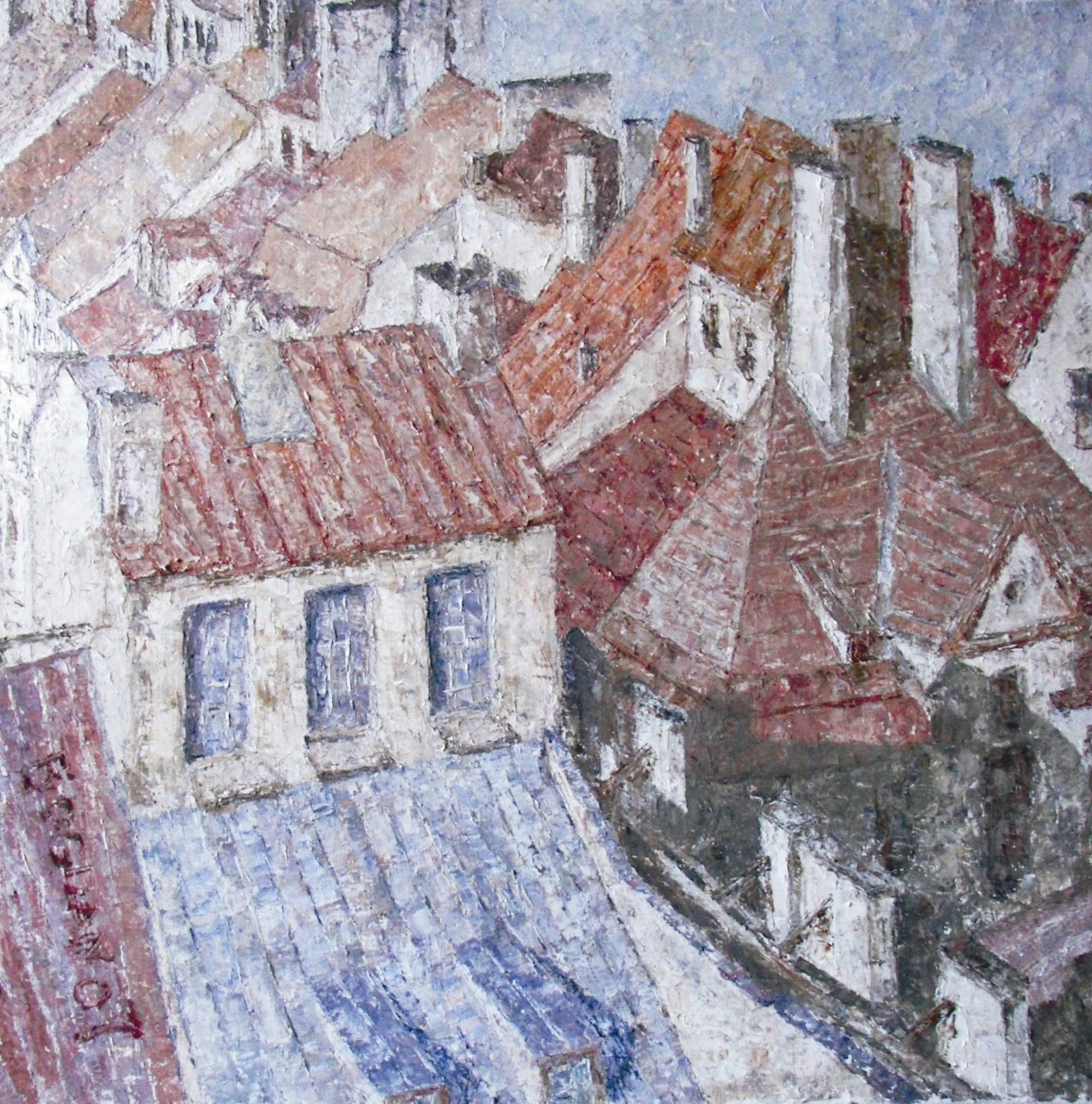 Obraz ukazuje gęsto usiane dachy starego miasta, gdzie kolory czerwieni, brązu i błękitu tworzą harmonijną mozaikę. Każdy dach ma nieco inny odcień, co dodaje głębi i dynamiki. Linie dachów przecinają się, tworząc coś na kształt miejskiego labiryntu. Artysta zdołał uchwycić niepowtarzalną atmosferę spokoju i melancholii miasta. Coś w stylu "szarych dni pełnych wspomnień", jakby dźwięk dzwonów kościelnych dobiegał gdzieś w tle. Styl dzieła jest zdecydowanie impresjonistyczny. Użyta technika gry świateł i cieni nadaje całości iluzję przestrzeni. Grubo nakładane pociągnięcia pędzla, niemalże widoczne gołym okiem, kreują teksturę obrazu. Ten obraz może wywoływać uczucie nostalgii - wspomnienie spacerów po starych uliczkach o zachodzie słońca, kiedy życie płynie wolniej. "Są tam domy jak w bajce!" mogłoby powiedzieć dziecko, patrząc na ten obraz. Dla mnie jest to mały kawałek magii zaklętej w płótnie. Ta "magic" potęguje poczucie zasiedzenia i ciepłej domowości. Obraz zaprasza, by usiąść z filiżanką herbaty i zatracić się w jego szczegółach.