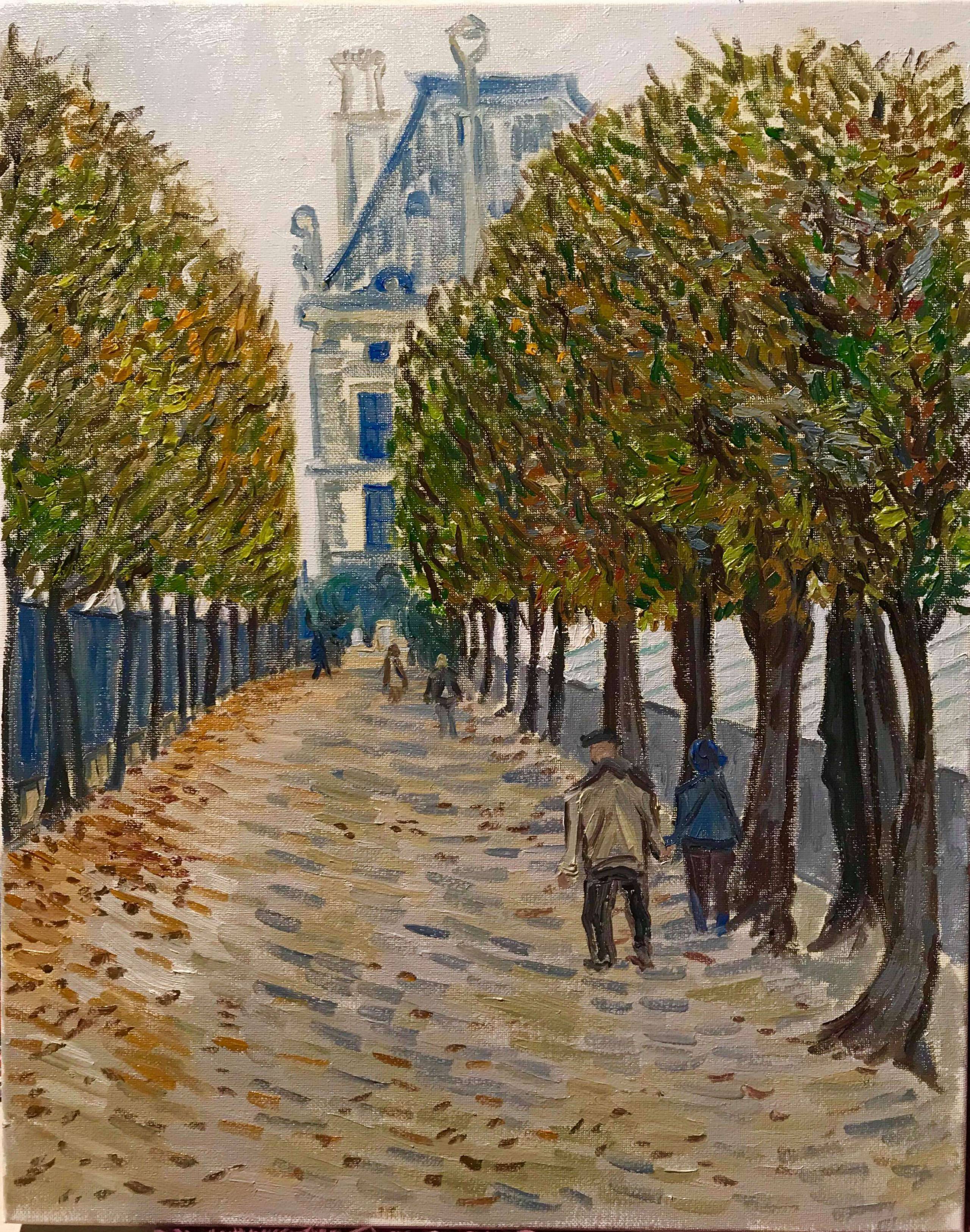 Obraz przedstawia idylliczną scenę spacerową wzdłuż alei obsadzonej drzewami, prowadzącej do majestatycznego budynku w tle. Dominują tu ciepłe barwy brązów i zieleni z subtelnymi akcentami błękitu. Liście na drzewach emanują lekkim, jesiennym powiewem, co dodaje kompozycji rustykalnego uroku. Artysta posłużył się impastem, delikatnie nakładając farbę, co nadaje obrazowi teksturę i głębię. Nastrój dzieła jest spokojny, prawie senny, jakby świat zatrzymał się na chwilę tylko po to, byśmy mogli go podziwiać. Styl malarski nawiązuje do impresjonizmu, z akcentem na luźne, spontaniczne pociągnięcia pędzla. Kiedy patrzysz na obraz, czujesz jakbyś naprawdę tam był, czuł szelest liści pod stopami i chłodny powiew wiatru na twarzy. Wow, to takie "relaxing"! Można poczuć się niemal jak dziecko bawiące się w parku jesienią — "Patrz mamo, jak liście spadają!" Wrażenie, które zostawia ten obraz, to spokój i nostalgiczna zaduma. Dla jednych może być symbolem minionych czasów, dla innych tylko piękną sceną z jesiennego dnia. Osobiście, czuję ciepło i lekkość patrząc na tę harmonijną kompozycję. To przypomnienie, żeby czasem zwolnić i docenić chwilę.