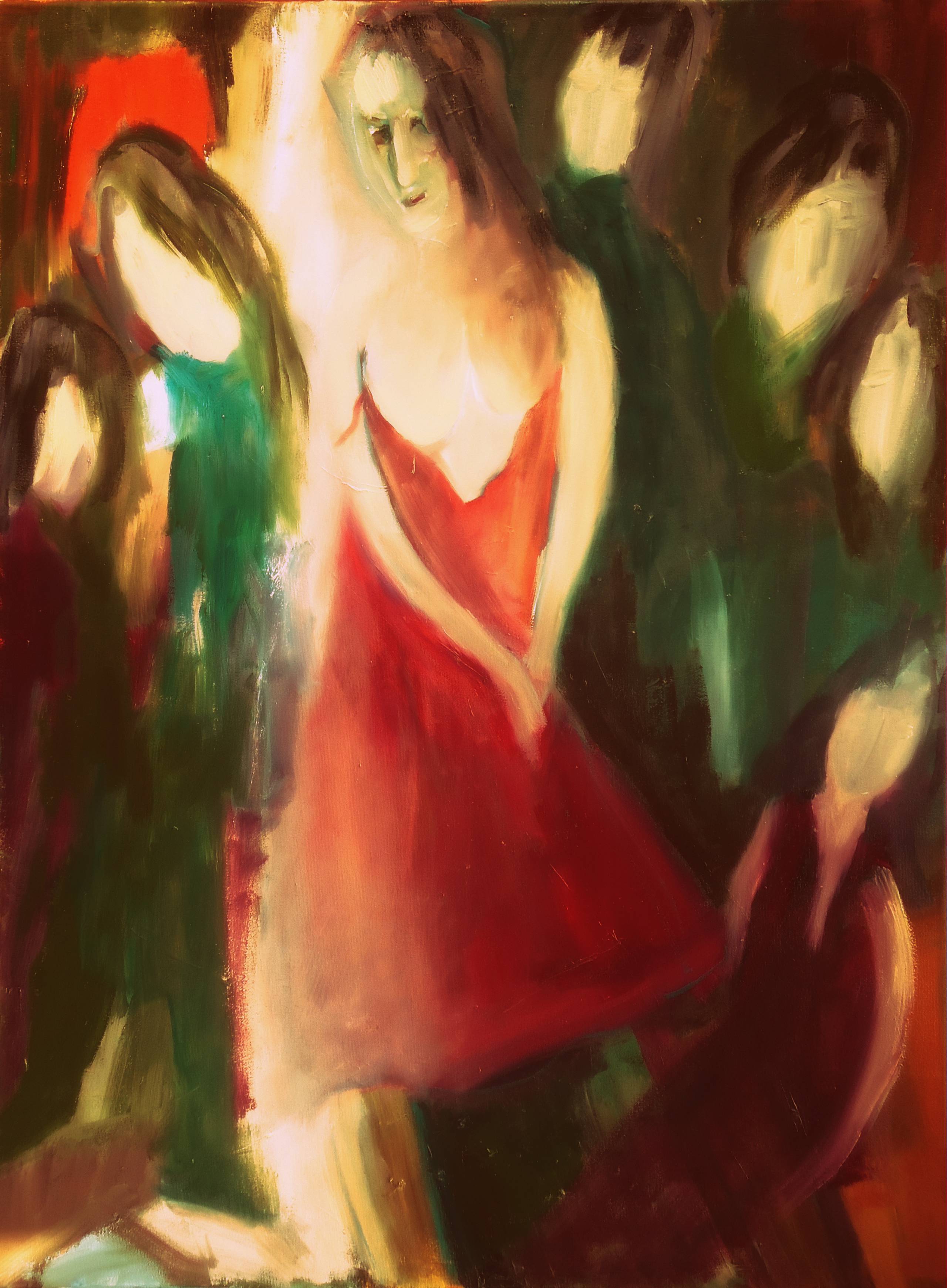 Obraz emanuje tajemniczym pięknem, gdzie dominują ciepłe odcienie zieleni i czerwieni. Centralna postać w czerwonej sukni wydaje się być nierozpoznawalna, jakby zamglona, a wokół niej krążą cienie innych postaci, które tworzą pewien rodzaj chaosu. Kiedy patrzysz na tę scenę, czujesz jakby czas się zatrzymał, a jednocześnie pędził. Atmosfera obrazu jest nieco melancholijna, ale w tej melancholii kryje się coś niezwykle ujmującego, wręcz magicznego. Artysta zastosował technikę impasto, sprawiając, że kolory mieszają się ze sobą, tworząc niemalże płynne przejścia. To takie "blurry" wrażenie dodaje wyglądu jak ze snu, jakiegoś wspomnienia, które nie chce się zmyć. Wszystko zdaje się być lekko niedopowiedziane, co otwiera przestrzeń dla własnej interpretacji. Patrząc na obraz, można poczuć coś w rodzaju nostalgii, jakby przypominał dawno zatarte wspomnienia z dzieciństwa. Wyobraźnia może poszybować gdzie chce, bo obraz nie narzuca interpretacji, a raczej zachęca do własnych przemyśleń. "To jak malowanie w wodzie" – powiedziałoby dziecko. Jednym słowem, ten obraz to prawdziwe zaproszenie do refleksji, do zgubienia się na chwilę w świecie wyobraźni i emocji.