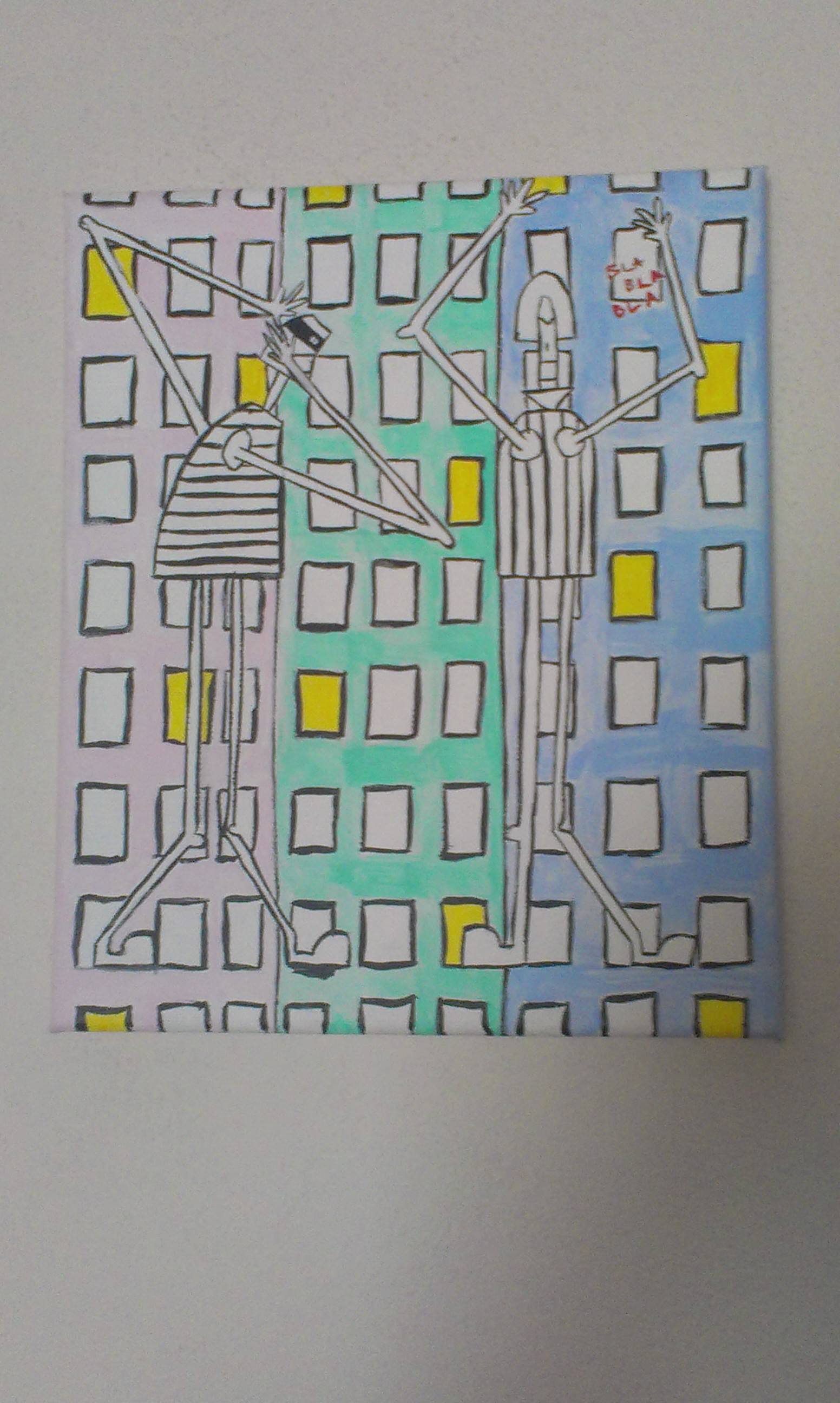 Na obrazie widzimy dwie postaci o długich, niemal groteskowych kończynach, rozgrywających swe sceny na tle kolorowego, geometrycznego wzoru. Pastelowe barwy – róż, zieleń i niebieski – zdobią tło, tworząc dynamiczny, lecz zarazem spokojny rytm prostokątów. Żółte kwadraty dodają nieco energii i kontrastu, przez co kompozycja wydaje się pełna życia. Artysta zastosował technikę cartoonową, charakteryzującą się wyrazistymi konturami i uproszczoną formą. Atmosfera dzieła jest swobodna, nieco surrealistyczna, jakby wyjęta z kart współczesnego komiksu. To, co najbardziej przyciąga wzrok, to niesamowita lekkość postaci, ich niepohamowana ekspresja i humor. Czy oni tańczą, a może toczą jakiś dialog? Tego nie wiem, ale wydają się szczęśliwi i pełni energii. Widok ten wywołuje uśmiech na twarzy i zachęca do własnych interpretacji. Dla siedmiolatka mógłby oznaczać „fajną zabawę na placu zabaw”. Dla dorosłego – może być refleksją nad otaczającą nas zabawnie-chaotyczną rzeczywistością. Styl obrazu, choć z pozoru prosty, ukazuje mistrzostwo w uchwyceniu esencji ruchu i życia. To dzieło to prawdziwy „eye-catcher”, przyciąga uwagę i pobudza wyobraźnię.