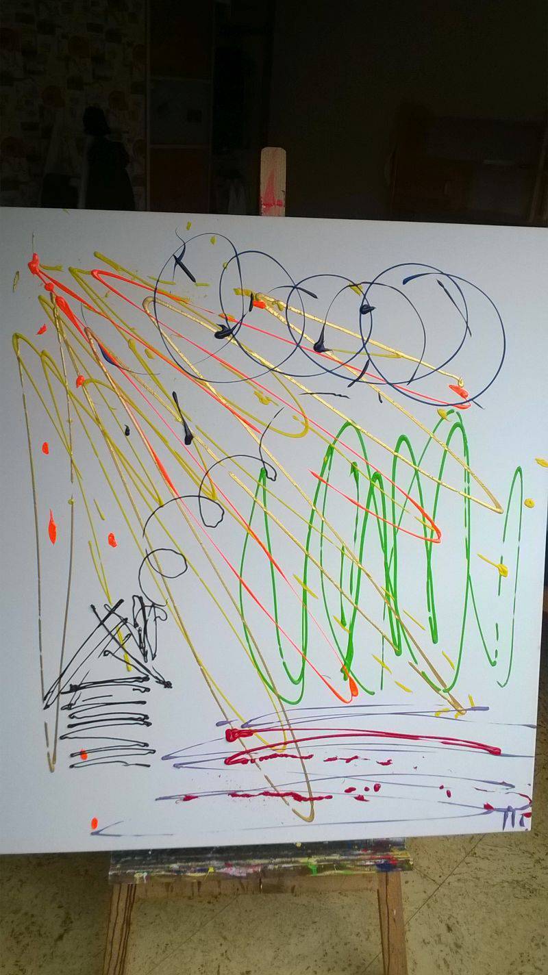 Obraz przyciąga wzrok dynamiczną mieszanką barw i form. Na jasnym tle figlują żywe kolory: czerwony, zielony, żółty i niebieski, tworząc prawdziwy festiwal kształtów. Linije zakręcają się, skręcają, a niektóre z nich biegną w poprzek obrazu niczym strzały. Artysta stosuje technikę przypominającą action painting, która nadaje kompozycji wrażenie ruchu. Pociągnięcia pędzla są nieprecyzyjne, chaotyczne, co sprawia, że obraz emanuje niesamowitą energią i pasją. Atmosfera jest radosna, pełna życia, a jednocześnie nieco nieprzewidywalna. Obraz może wywołać u widza różne emocje. Dla niektórych będzie to czysta radość z chaosu, inni mogą poczuć nostalgia za dzieciństwem. "Nie wiem co to jest, ale mi się podoba!" — takie zdanie mogłoby paść z ust dziecka. Personalnie, patrząc na to dzieło, czuję ekscytację. To taki „wow” moment. Każdy element zdaje się krzyczeć, by zwrócić na siebie uwagę. Jest w tym coś fascynującego. Jedno jest pewne – to po prostu artystyczny rollercoaster!