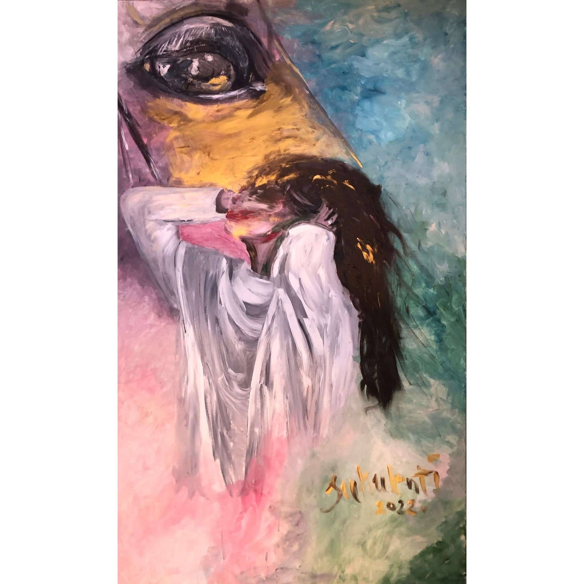 Ten obraz przyciąga wzrok swą różnorodnością barw i niezwykłą kompozycją. Dominują ciepłe odcienie żółci i różu, które subtelnie przechodzą w chłodniejsze niebieskie tonacje. Na pierwszym planie widzimy postać kobiety z przymkniętymi oczami, wydającej się zatapiać w jakimś tajemniczym śnie. Jej biała szata kontrastuje z dynamicznym tłem, nadając całości pewien balans. W tle widnieje tajemnicze oko, które jakby spoglądało prosto na widza, dodając kompozycji odrobinę surrealizmu. Atmosfera obrazu jest pełna zagadkowości, jednocześnie spokojna i nieco niepokojąca. Można poczuć pewną melancholię i tęsknotę. Artysta z zastosowaniem impastu nadał głębię i fakturę poszczególnym elementom, co sprawia, że obraz wydaje się niemal trójwymiarowy. Technika ta, z charakterystycznymi śladami pędzla, dodaje mu ekspresji. Obraz wywołuje emocje. Czy to zamyślenie, czy marzenie? A może wspomnienie jakiegoś fragmentu życia? Każdy może dostrzec w nim coś innego, co poruszy jego serce. To trochę jak "dream" w rzeczywistości. Dziecko mogłoby powiedzieć, że kobieta wygląda jak w bajce. Osobiście czułam jakąś wewnętrzną ciszę, która pozwala mi wejść w świat innych refleksji.