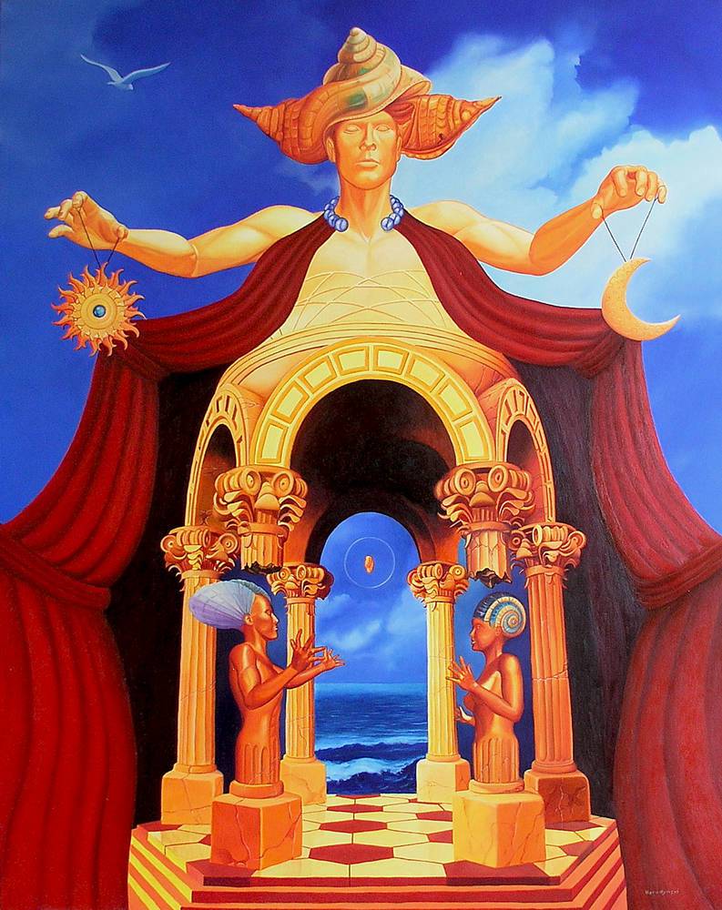Obraz emanuje niezwykłą aurą tajemnicy i magii, jakbyśmy przenieśli się w świat snu. Dominują ciepłe odcienie złota, ochry i czerwieni, które harmonijnie łączą się z głębokim błękitem nieba i morza. Centralnym punktem kompozycji jest postać przypominająca mistycznego władcę, z muszlą na głowie, unosząca ręce w geście pełnym symboliki. Po bokach widzimy filary, które tworzą iluzję bramy prowadzącej ku nieznanemu. Postacie u stóp władcy wydają się być zaangażowane w rytuał, ich sylwetki i gesty dodają atmosfery tajemnicy. Styl artysty jest wręcz surrealistyczny, nawiązując do mitologicznych opowieści i snów. Technika malarska, z rozmachem zastosowane cieniowanie i kontrasty, sprawia, że całość wydaje się niemal trójwymiarowa. Obraz przypomina sen, gdzie wszystko wydaje się możliwe, a jednocześnie nieuchwytne. "Wow, jakie to kolorowe i fajne!" powiedziałby mały artysta z zachwytem. Odbiorca może czuć się jak eksplorator nieznanego lądu, z odrobiną niepokoju i fascynacji. To dzieło pobudza wyobraźnię, prowokuje do interpretacji i odkrycia, co jest za tymi drzwiami. Klimat obrazu skłania do refleksji nad połączeniem naruralnego świata z duchowym wymiarem. Oto magia i mystery w najszczystszej postaci. Cokolwiek ma znaczyć, jest captivating i z pewnością zostaje w pamięci.