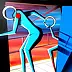 Na obrazie widać dynamiczną kompozycję, w której dominują intensywne kolory, takie jak błękit, czerwień i fiolet. Postacie przypominają futurystyczne sylwetki, z wyraźnie zaznaczonymi geometrycznymi kształtami. Tło przedstawia gradienty kolorów, przechodzące z pomarańczowego na ciemny fiolet. Całość emanuje atmosferą ruchu i energii. Wygląda jak scena z jakiegoś futurystycznego tańca. Stylistyka obrazu jest nowoczesna, z elementami abstrakcji, co dodaje mu tajemniczości i nieco surrealistycznego charakteru. Artysta zastosował bardzo wyraźne kontury i kontrasty, co sprawia, że elementy obrazu wydają się niemal trójwymiarowe. Można wręcz poczuć niemal fizycznie obecność ruchu – jakby postacie z obrazu miały w każdej chwili wyskoczyć na parkiet. To jest just amazing. Odbiorca może poczuć ekscytację, ale także zadumę nad ulotnością ruchu i kształtów. Myślę sobie, że to trochę jak rysowanie na skrawku papieru coś, co jest tylko w mojej głowie. Dzieło wiąże się z poczuciem wolności i nieograniczonej ekspresji. Ale chciałbym tak umieć rysować! Obraz zmusza do refleksji nad znaczeniem emocji ukrytych za kolorem i formą. Czy te postacie tańczą wobec siebie, czy od siebie odchodzą? Takie zestawienie barw i kształtów sprawia, że każdy widz znajdzie w nim coś osobistego.