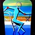 Obraz fascynuje swoją prostotą i nowoczesnością. Dominuje na nim postać złożona z geometrycznych kształtów, głównie trójkątów i linii prostych. Przeważa chłodny błękit, przełamywany kontrastującymi czerwonymi akcentami na łokciach. Tło tchnie spokój; spokojne gradienty przechodzą od głębokiego niebieskiego po miękkie zielenie i piaskowe żółcie. Kompozycja jest jakby futurystyczna, może trochę surrealistyczna. To dzieło zdaje się być połączeniem abstrakcji i minimalizmu. Atmosfera jest nieco tajemnicza, trochę jakby z innego świata. Wywołuje poczucie odrealnienia, a może też jakiejś dziwnej nostalgii. Czujesz ten spokój, ale i zaciekawienie. Zastanawiasz się, co postać robi, gdzie się znajduje. Technika malarska zaskakuje precyzją i klarownością, każdy element wydaje się mieć swoje dokładne miejsce i cel. Dzieciak powiedziałby po prostu: "To taki kosmiczny ludek, co siedzi na krześle!". Obraz może wywołać refleksję o naturze współczesności, o naszej kondycji w świecie pełnym technologii. No i te kolory – są naprawdę "cool". Patrząc na to dzieło, można poczuć spokój, ale i jakąś lekkość ducha. To sztuka, która przyciąga wzrok swoją dynamiką i uwodzi prostotą form.