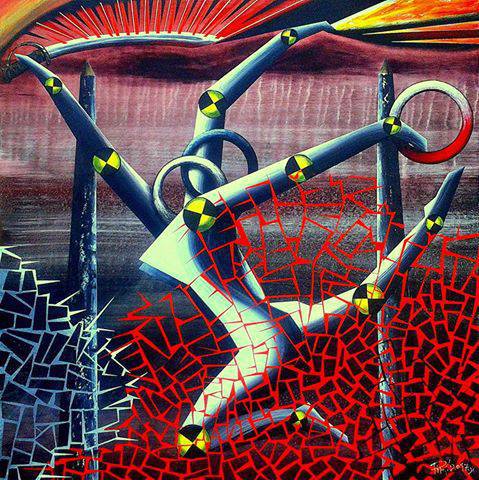 Na obrazie widać dynamiczną kompozycję pełną kontrastów i ekspresji, dominują nasycone kolory – intensywna czerwień, głęboki błękit i ostrze żółci. Wszystko to jakby zatopione w kalejdoskopowym wirze kształtów. Kanciaste figury i geometryczne linie układają się w coś, co przypomina fragmenty łamigłówki. W centrum, postać zanurzona w czerwonym, przypomina akrobatyczne ruchy, jest jak balet na granicy abstrakcji. Tańcząca figura przykuwa wzrok, jej ciało wydaje się elastyczne, jakby przekraczało fizyczne ograniczenia. Tło, wypełnione ciemnymi, niemalże burzowymi odcieniami, potęguje uczucie ruchu i napięcia. Mood? To takie rollercoaster emocji. Chaos i energia mieszają się, jakby malarz próbował uchwycić ulotny moment swobodnego tańca na tle burzowej nocy. Niektóre elementy wydają się ręcznie malowane, inne mają wręcz cyfrową precyzję, co wskazuje na eklektyczne podejście artysty. To połączenie tradycyjnej techniki z nowoczesnością. Nie sposób przejść obok obojętnie, ten obraz prowokuje różnorodne interpretacje. Dla mnie, to metafora walki z własnymi ograniczeniami. Jest jak skaczący kamyk, bounce, który rozbija szarość codzienności. Dzieciak by pewnie powiedział: "Ale tam się dużo dzieje!", bo rzeczywiście, każda linia, każdy kolor zdaje się żyć własnym życiem. Wciąga w wir emocji, za jednym spojrzeniem odkrywa tajemnice ukryte między prostymi liniami a dziko wirującymi formami.