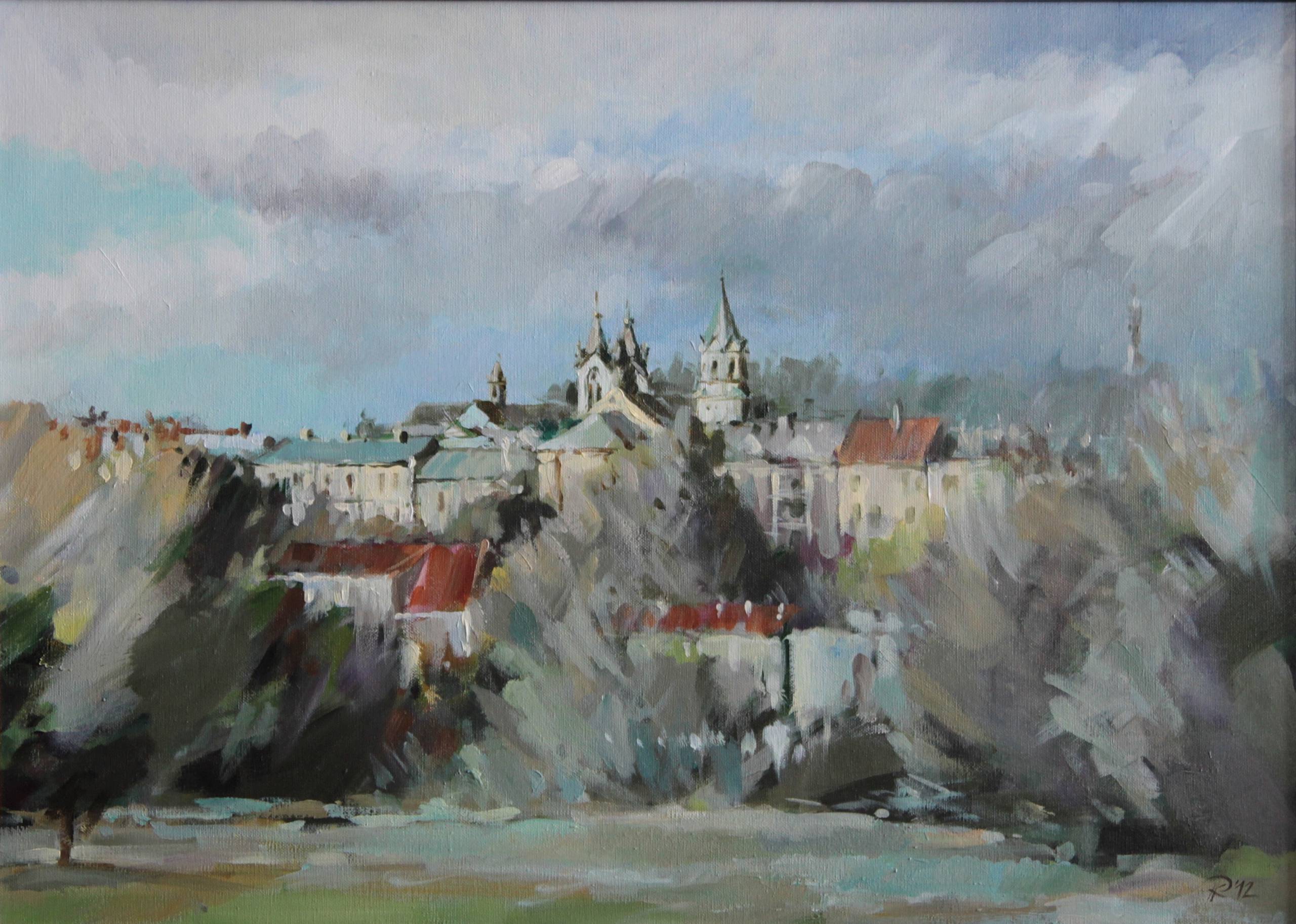 Obraz przedstawia malowniczy widok miasta, ukryty w delikatnych tonach szarości i błękitu. Dominują tu miękkie pociągnięcia pędzla, które nadają budowlom lekko rozmyty charakter. Stare kamienice z czerwonymi dachami subtelnie kontrastują z błękitami nieba, pełnego puszystych, cotton candy clouds. Kompozycja jest otwarta i zaprasza do głębszego zanurzenia się w zimowy klimat, gdzie niepewność pogody dodaje pewną dozę tajemniczości. Artysta zdaje się eksperymentować z impresjonistycznym stylem, kładąc nacisk na grę światła i cienia. Użycie delikatnych przejść tonalnych wywołuje nostalgiczne emocje, przypominając o magicznych zimowych wieczorach. Czuję się, jakbym był tam, spacerując po prostu uliczkami i wdychając świeże powietrze. Wydaje się niemal słychać lekki szelest liści czy odgłos dalekiego dzwonu. Mama, tam jest duży dom! Ten widok z pewnością przywołuje zarówno wspomnienia, jak i tęsknotę za spokojem dawnych czasów. Mistrzowskie połączenie kolorów i struktur tworzy atmosferę, w której każdy znajdzie coś dla siebie, a sztuka żyje własnym życiem.