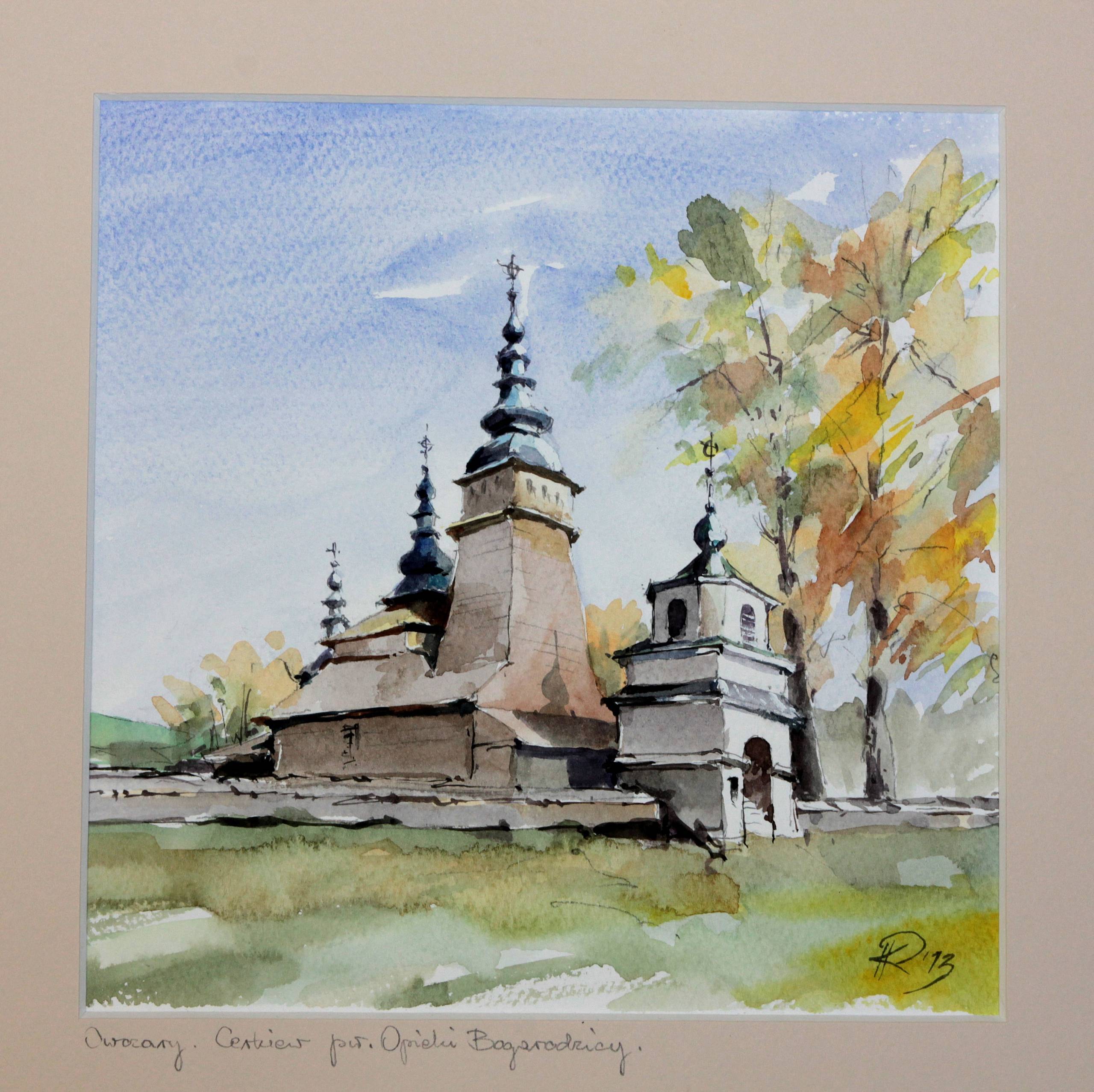 Na obrazie widzimy urokliwą cerkiew w otoczeniu spokojnego krajobrazu. Budowla, z charakterystycznymi, ciemnymi kopułami, wyróżnia się na tle delikatnego, błękitnego nieba. Ciepłe odcienie beżu ścian kontrastują z jaskrawą zielenią otaczających drzew, które są lekko zamglone, jakby przefiltrowane słońcem. Technika akwareli dodaje dziełu lekkości, a delikatne pociągnięcia pędzla nadają całości subtelny dynamizm. Kolory delikatnie się przenikają, co stwarza efekt płynności i harmonii. Atmosfera obrazu jest niezwykle spokojna i nostalgiczna. Przywodzi na myśl leniwe popołudnie spędzone na wsi, z dala od zgiełku codzienności. Styl artysty jest lekki i impresjonistyczny, przez co obraz wydaje się niemal 'alive'. Dla mnie, ten obraz to jak liźnięcie dream, sielska chwila zamknięta w ramach akwareli. Można poczuć cichą obecność historii, jakby imaginować echa dawnych modlitw unoszących się w powietrzu. Takie ujęcie miejsca wywołuje uczucia spokoju i refleksji nad przemijającym pięknem. Dziecko może powiedzieć: „To miejsce wygląda jak z bajki”. I rzeczywiście, coś magicznego tkwi w tej prostocie i detalu. Patrząc na dzieło, czuję się jakbym tam była – niemal czuję zapach trawy i usłyszała szum liści na wietrze. Czasem to właśnie takie chwile zapadają w pamięć na długo, prawda?