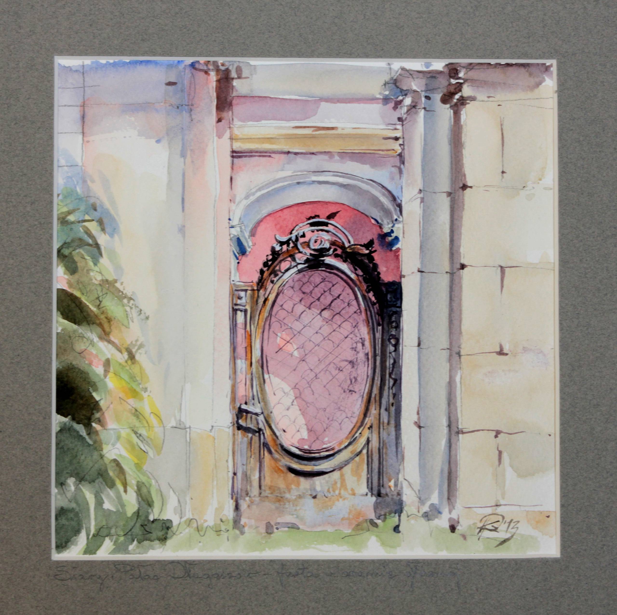 Obraz przedstawia eleganckie drzwi, które wydają się jak brama do innego świata. Kolory tła są delikatne, pastelowe - dominują beże, różowe i subtelne zielenie. Drzwi mają bogato zdobioną, owalną ramę ze stalą w kolorze ciemnej miedzi. Artysta zastosował akwarelę, co nadaje dziełu lekkości i zwiewności. Technika ta pozwala na subtelne przejścia między kolorami, które tworzą miękką, niemalże marzycielską atmosferę. Ten obraz emanuje spokojem i tajemniczością, jakby skrywał wiele historii za zamkniętymi drzwiami. Czujesz, że za nimi mogą być ukryte childhood secrets. Styl jest lekko impresjonistyczny, z delikatnym naciskiem na szczegóły architektoniczne. Obrazy takie wywołują nostalgiczne wspomnienie dawnych lat. Gdy patrzę na te drzwi, myślę: "Ciekawe, kto za nimi mieszkał?" A może tam były skarby? Jakaś część mnie ma ochotę otworzyć je i odkryć tajemnice przeszłości. To jak odkrywanie skrzyni skarbów w starym domu. Atmosfera jest subtelna, ciepła i pełna niewypowiedzianego uroku, który przyciąga i fascynuje każdego, kto na nią patrzy.