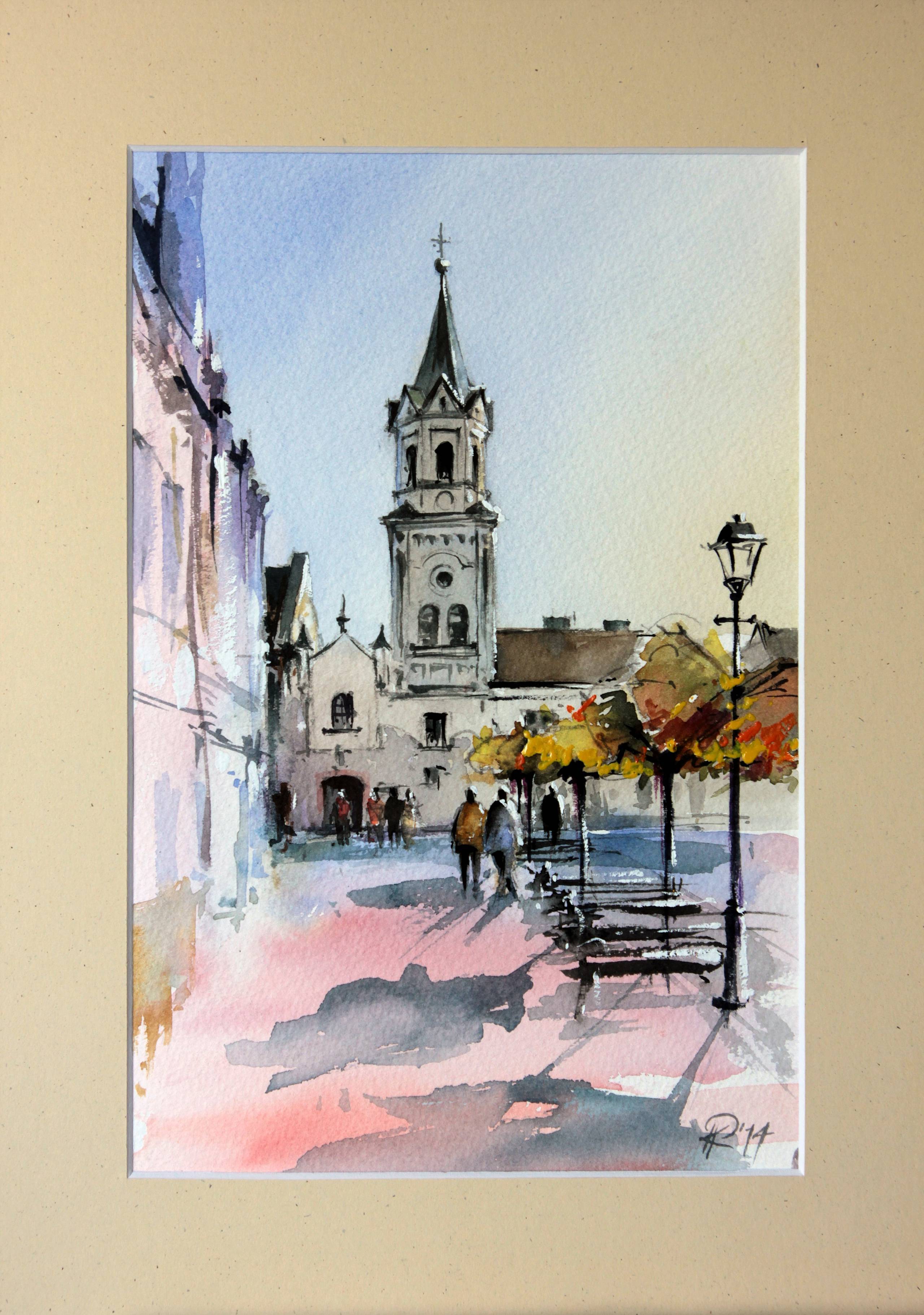 Na obrazie widzimy malowniczą scenę miejską, zachowaną w delikatnych, pastelowych odcieniach. Dominujące kolory to błękit nieba, łagodne róże ziemi i subtelne beże budynków. Kompozycja obrazu prowadzi nasze oczy ku imponującej wieży kościoła, która majestatycznie wznosi się ku niebu. Artysta użył techniki akwareli, co widać po płynnych przejściach kolorów i lekkim, niemalże efemerycznym charakterze całej pracy. Atmosfera dzieła jest spokojna i idylliczna, z lekkim powiewem nostalgii. Spacerujący ludzie i ławki pod drzewami wskazują na poczucie zatopienia w codziennym życiu w małym miasteczku. Powietrze wydaje się być przejrzyste, a światło miękko oświetla całą scenę. Obraz emanuje ciepłem i zachęca do zatrzymania się, by docenić moment. Wyobrażam sobie, jak siedzę na jednej z ławek, czując delikatny powiew wiatru. Obraz może wywołać uczucie tęsknoty za prostymi chwilami, które w codziennym zabieganiu łatwo przegapić. There’s a sense of timelessness in the painting, something that invites us to pause and just be. Jak mówił mój młodszy brat: "To wygląda jak bajka".