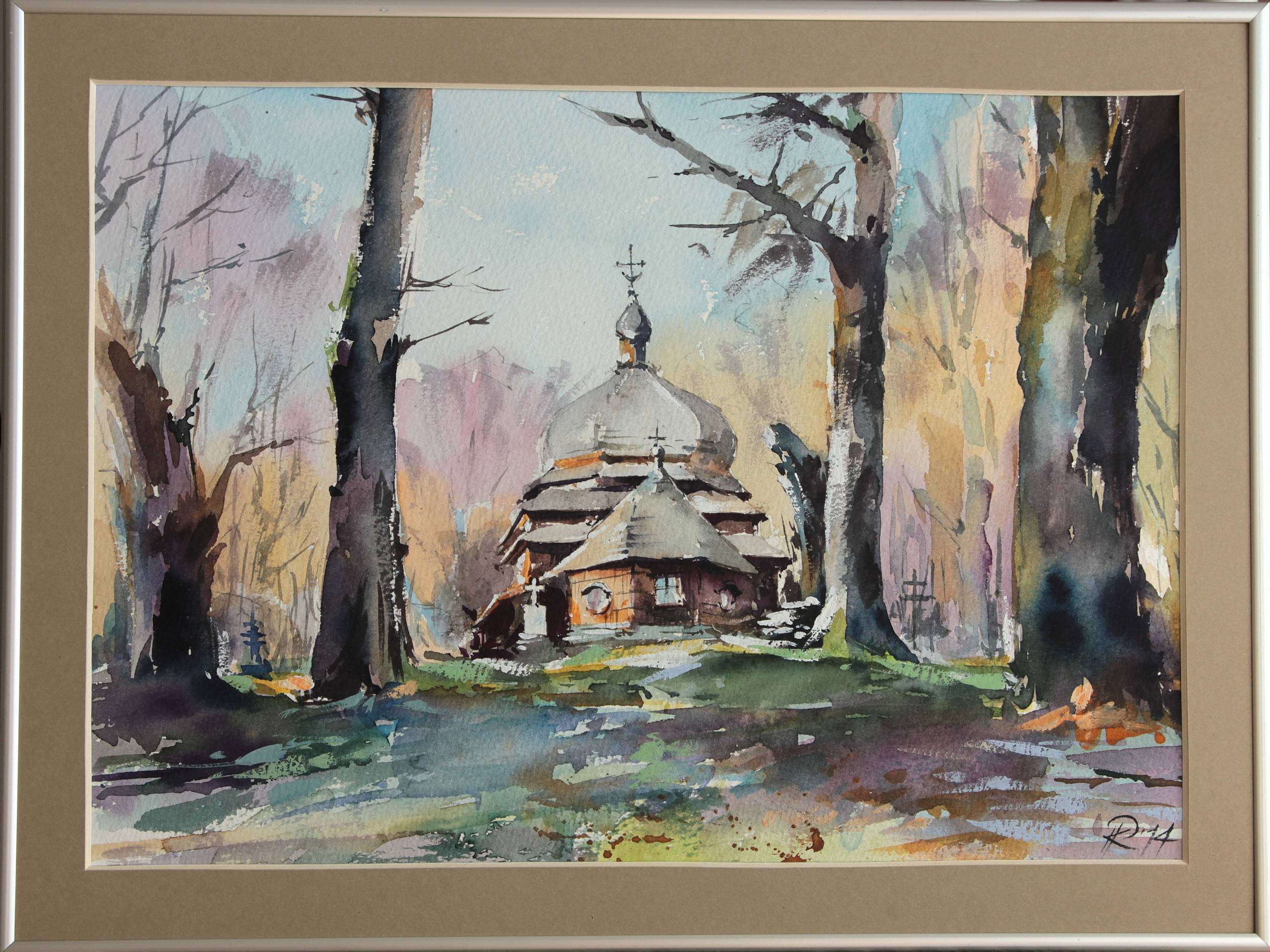 Obraz przedstawia wiejski kościółek skryty w cieniu imponujących drzew. Dominują tu kolory ziemi: głębokie brązy, zgaszone zielenie i ciepłe odcienie beżu. Całość zanurzona jest w delikatnym świetle, które rozprasza się przez nagie gałęzie. Kompozycja jest wyważona, a centralne miejsce zajmuje kościół, który zdaje się zapraszać widza do odkrycia swoich sekretów. Atmosfera obrazu jest spokojna, może nawet trochę magiczna. To miejsce, gdzie czas płynie wolniej, a cisza jest czymś więcej niż tylko brakiem hałasu. Taki "calmness" bije od tej akwareli, która wręcz oddycha spokojem i harmonią. Artystę można podziwiać za mistrzowskie użycie akwareli. Technika delikatnych pociągnięć pędzla, które sprawiają, że obraz wydaje się żywy i pełen ruchu, to strzał w dziesiątkę. Można rzec, że woda na papierze stała się prawdziwym narzędziem do uchwycenia subtelności przyrody. Kiedy patrzę na ten kościółek, czuję nostalgię. Wspomnienie o dawnych czasach, babcinej wsi i chwytających za serce wakacjach. Dla niektórych może to być refleksja nad przemijaniem, dla innych ucieczka w idylliczny zakątek świata. Hej, to miejsce jest jak z bajki! Dziecko powiedziałoby pewnie: te drzewa są tak wysokie jak tata! Ten obraz to nie tylko dzieło sztuki, to portal do krainy emocji i marzeń, który każdy powinien zobaczyć na własne oczy.