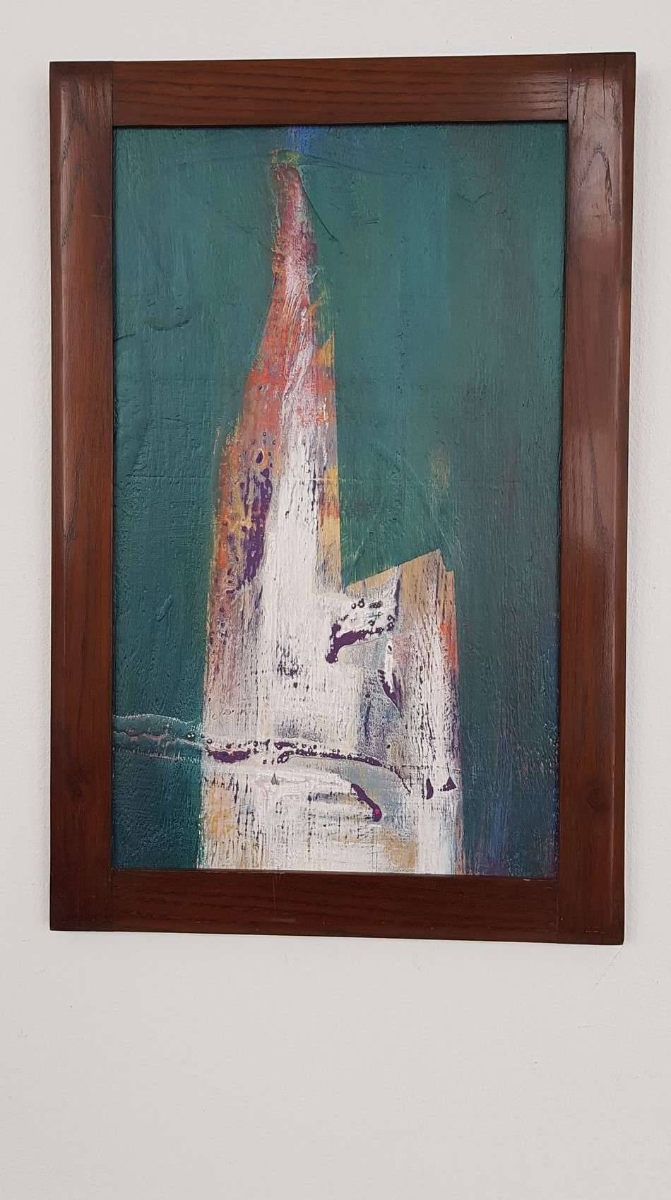 Na obrazie dominują intensywne kolory: ciemna zieleń, która tworzy tło, kontrastuje z mieszanką bieli, czerwieni i pomarańczu. Kompozycja jest dynamiczna, z abstrakcyjną formą, która przyciąga wzrok ku centralnej części dzieła. Gruba faktura farby sugeruje, że artysta użył techniki impasto, co nadaje obrazowi trójwymiarowości i głębi. Atmosfera jest nieco tajemnicza, jakby obraz skrywał jakieś ukryte znaczenie. Czuję się, jakbym patrzył na coś, co można by zatytułować "życie wewnętrzne". Czy to butelka, czy może coś zupełnie innego? Może to po prostu sen? To zależy od perspektywy widza. Ten obraz wywołuje uczucie niepokoju, ale też ciekawości. Z jednej strony emanuje spokojem, z drugiej dynamiką barw i form. Look at these colors! Takie zestawienie barw jest jednocześnie energetyczne i uspokajające. Mój mały brat powiedziałby: "To jak smok w butelce!". I coś w tym jest. Forma, która się wydobywa z tła, może przypominać postać z baśni. Zastanawiam się, co artysta chciał nam powiedzieć. Może to tylko forma ekspresji? Może skrywa głębszą opowieść. Czasami warto po prostu zanurzyć się w obrazie i pozwolić wyobraźni płynąć.