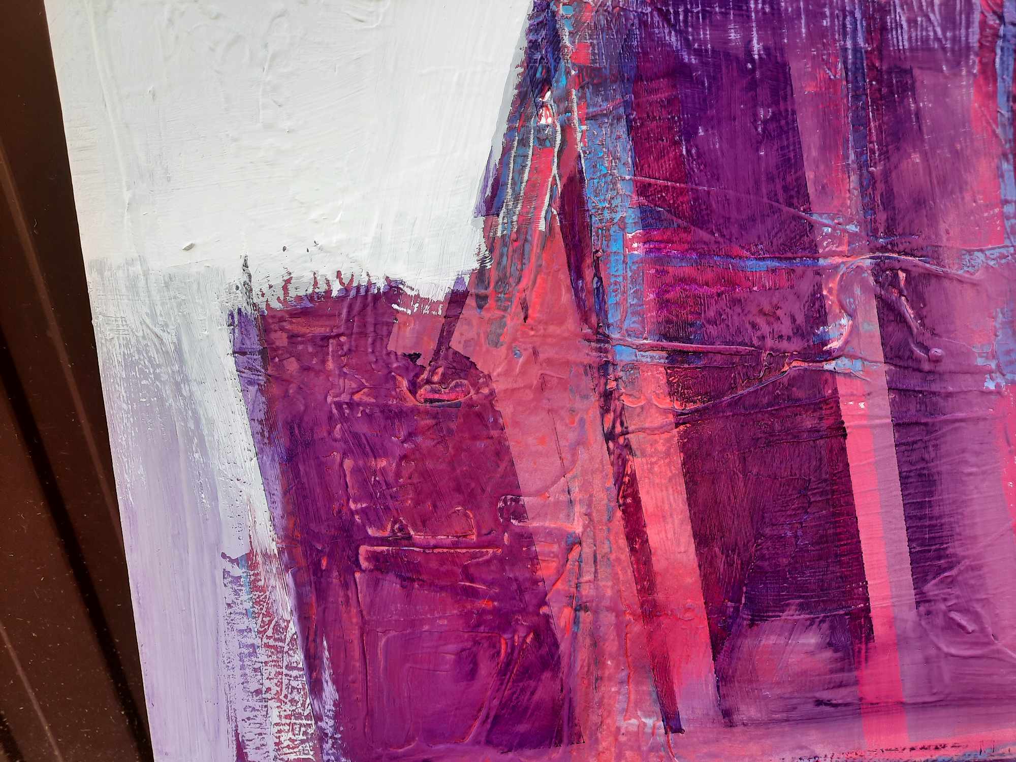 Na obrazie dominuje intensywny fiolet, mieniący się w różnych odcieniach. Kształty zdają się być nieregularne, a ich ostre linie nadają kompozycji dynamicznego charakteru. Pomimo pewnej abstrakcyjności, całość jest wyważona, a harmonia barw przyciąga wzrok widza. Pastelowe tło podkreśla geometryczne formy, które jakby tańczyły w swojej powadze. Czy te figury to budynki, czy może coś zupełnie innego? Nastrój obrazu jest tajemniczy, a zarazem spokojny. Tej wszechogarniającej ciszy dodaje głębi tekstura widoczna na płótnie. Czuje się jakby coś szeptało z zakamarków tych barw. Technika artystyczna przypomina impast, gdzie grubą warstwą farby artysta buduje przestrzeń. To coś jak magiczna opowieść zamknięta w kawałku canvasu. Wizualizacja ta wzbudza wiele emocji. Może to być nostalgia, a może fascynacja nieznanym. Z pewnością można poczuć, że artysta tworzył to z pasją i zaangażowaniem. „Wow, takie coś mogłoby zamieszkać w mojej bajecznej krainie!” – powiedziałoby dziecko. Czy to nie jest fascynujące? Takie obrazy potrafią przenieść cię w inny świat, a interpretation is limited tylko przez twoją wyobraźnię. Całość emanuje aurą spokoju i zaprasza do chwili refleksji.