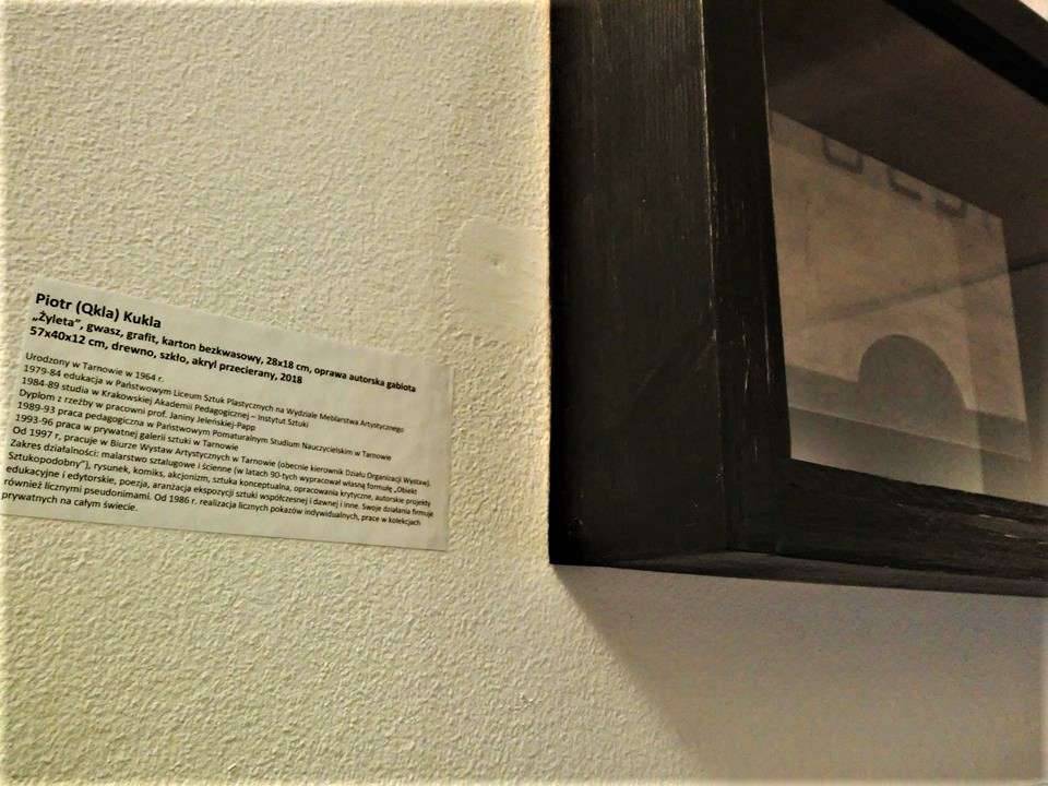 „Żyleta”, gwasz, grafit, karton bezkwasowy, 28x18 cm, oprawa autorska gablota 57x40x12 cm, drewno, szkło, akryl przecierany,(site specific installation), 2018 rok. Obiekt prezentowany na V Salonie Wiosennym BWA w Tarnowie