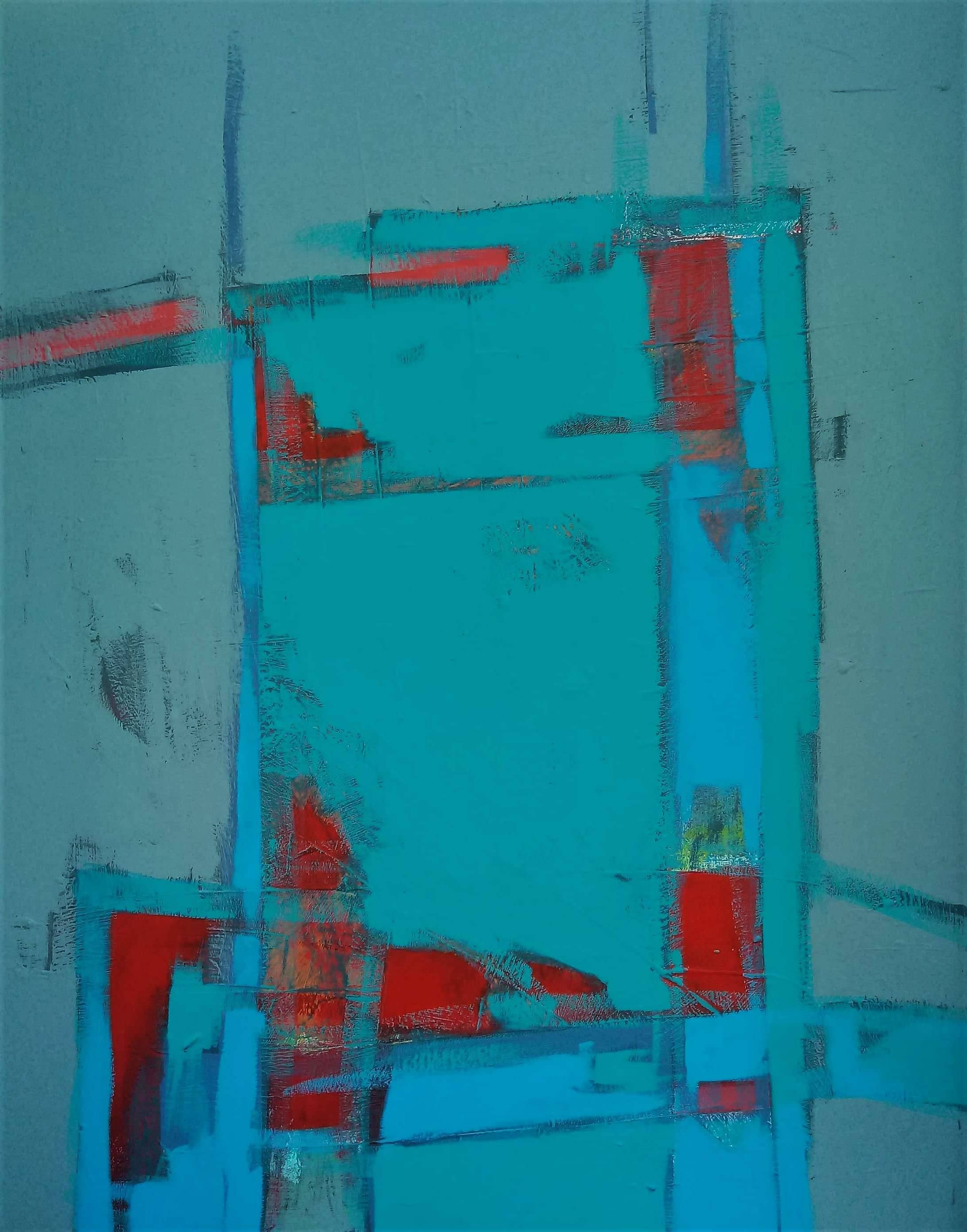 Na obrazie dominują odcienie błękitu, które tworzą tło pełne spokoju i tajemnicy, przerywane intensywnymi, czerwonymi akcentami. Kompozycja jest zbudowana z geometrycznych, prostych kształtów, które zdają się przypominać zapomniane budowle przyszłości. Artystka zastosowała technikę impastu, nadając strukturze głębię. Wrażenie chaosu i porządku jednocześnie buduje atmosferę refleksji. Obraz wciąga jak opowieść, w której trudno znaleźć jednoznaczne zakończenie. Może przywołać obraz metropolii za oknem, pełnej zarówno ruchu, jak i ciszy. Jest tu coś niezwykle interesującego - takie "wow!" dla wyobraźni. Jednocześnie możesz poczuć się jak odkrywca, który właśnie znalazł skarb. To dzieło emanuje surowym urokiem abstrakcji, można prawie "dotknąć" emocji zaklętych w każdym pociągnięciu pędzla. Kontemplując, zauważasz finezję kolorów i śmiałą energię, które wywołują refleksję nad dynamizmem i harmonią współczesnego życia. Może być to metafora napięcia między starym a nowym. Choć trudno to uchwycić, obraz skłania do zadumy i intensywnego przeżycia chwili.