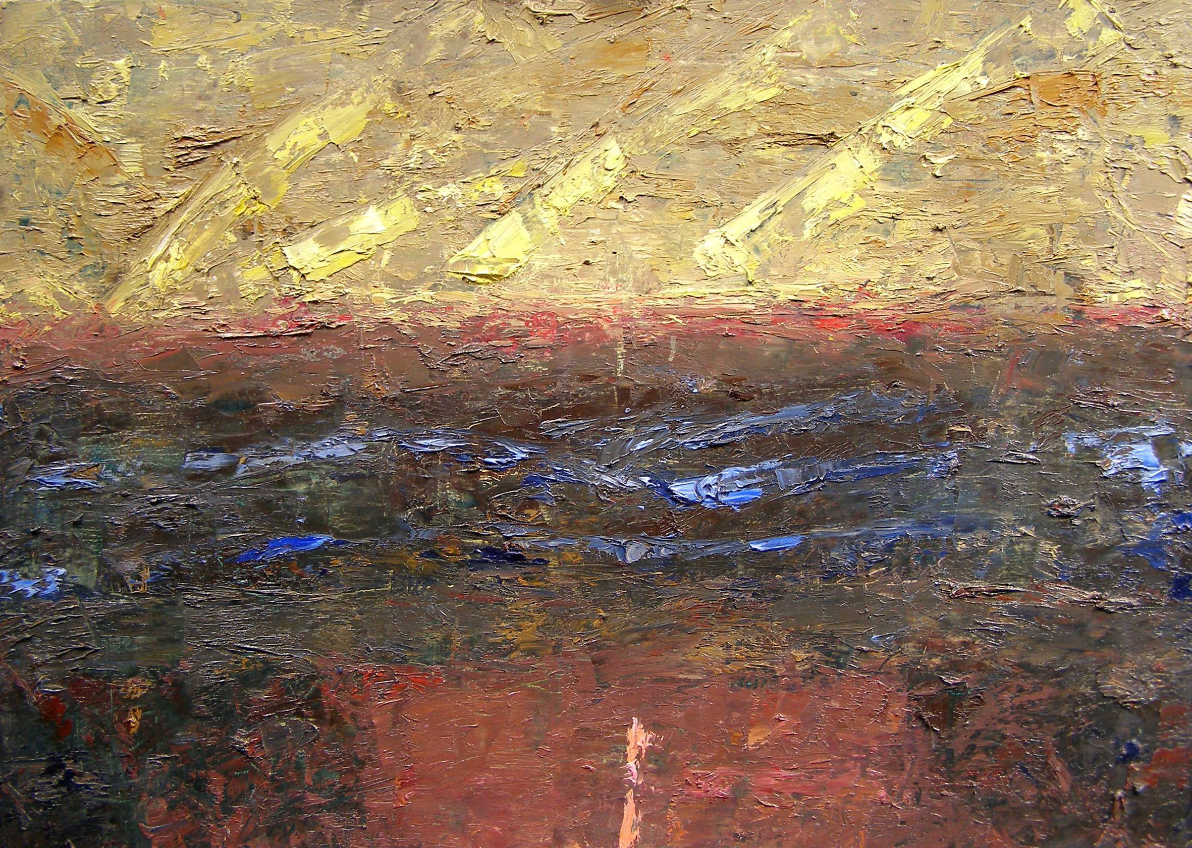 Obraz olejny na płótnie. Jest pewnym odniesieniem nawiązującym do pejzażu, ale takiego syntetycznego, odwołującego się bardziej do wewnętrznych przeżyć, tęsknot... To miejsce do poszukiwania treści ukrytych w kolorze, nastroju i malarskiej materii...