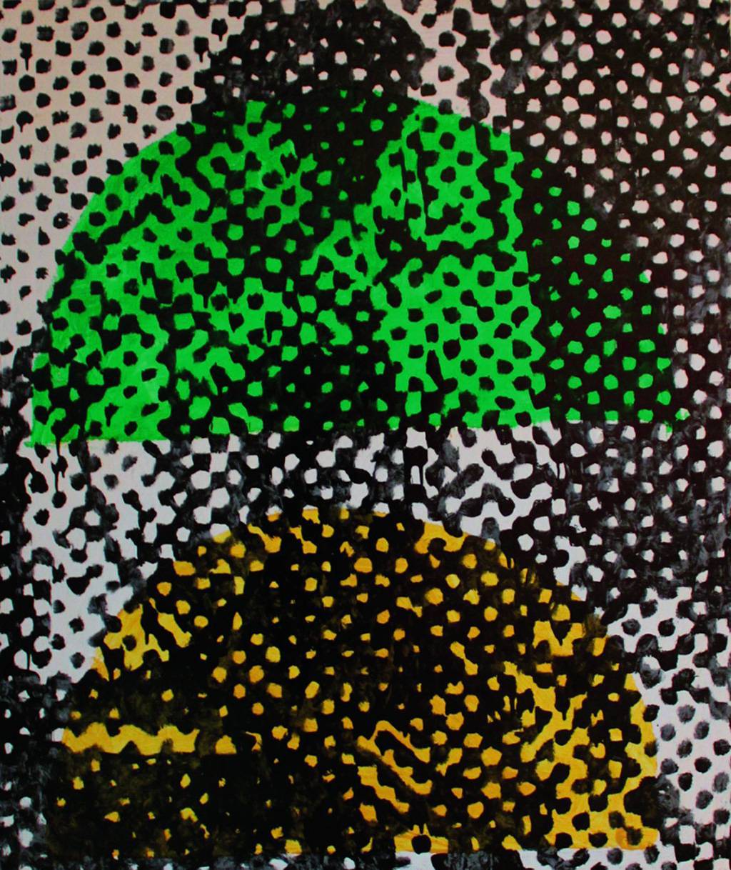 Obraz zatopiony w fascynującej feerii kolorów od razu przyciąga wzrok. Dominują głęboka zieleń i intensywna żółć, które tworzą kontrast z czarno-białymi, szachownicowymi wzorami. Kropki, niczym konstelacje gwiazd, rozlewają się na całej powierzchni, tworząc dynamiczny efekt ruchu. Artysta zdaje się bawić światłem i cieniem, używając technik przypominających pointylizm. To dziwna technika, ale skuteczna. Atmosfera jest pełna napięcia, jakby coś miało się zaraz wydarzyć. Patrząc na dzieło, czuje się pewne napięcie, ale także zaskakujący spokój. Przechodząc od jednej części obrazu do drugiej, widz doświadcza emocjonalnego rollercoastera. Czy to może być wizualizacja chaosu? A może po prostu taniec kolorów i kształtów w harmonii? Styl artysty jest dynamiczny, a jego swobodna kompozycja dodaje obrazu energii. Moje pierwsze wrażenie? Wow, ale to fajne! Interpretacja obrazu odsłania głębię emocji – od radości życia przez tajemniczość aż po refleksję. I muszę przyznać, że to dzieło naprawdę wprawia mój umysł w motion. Każda z kropek jest jak osobna opowieść, a cały obraz – książką pełną niespodzianek.