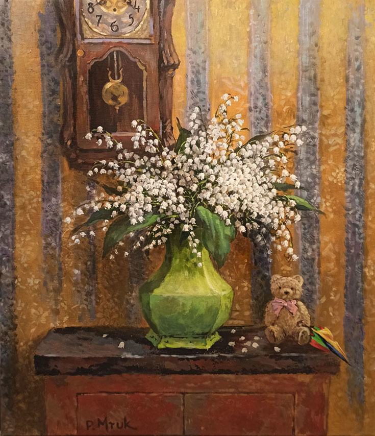 Obraz przyciąga wzrok eksplozją bieli konwalii w zielonym, eleganckim wazonie. Kompozycja jest harmonijna, a kolory ciepłe, dominują brązy i zielenie, co daje wrażenie przytulności. Na drewnianym stoliku oprócz kwiatów znajduje się pluszowy miś z różową kokardką. Wygląda, jakby czekał na powrót dziecka. Obok zegar ścienny, który zdaje się tykać, choć to tylko obraz. Artysta zastosował technikę impasto, nadając fakturze pewnej niewyraźności. Ta scena emanuje nostalgicznym nastrojem spokojnego popołudnia. Jest jak powrót do dzieciństwa, do bezpiecznych czasów. Czas na chwilę jakby stanął, zatrzymany w małej, intymnej przestrzeni. Patrząc na obraz, można poczuć zapach konwalii. Wow, ale fajne kwiatki! Pociągnięcia pędzla są krótkie, zdecydowane, co dodaje dynamiki kompozycji. Jednocześnie obraz ma coś z "old-fashioned" stylu, jakbyśmy spoglądali na scenę przez mgłę wspomnień. Wywołuje emocje pełne spokoju i refleksji. Prawie słyszymy cichy stuk zegara, który nadaje rytm naszym myślom. To miejsce, w którym serce bije wolniej.