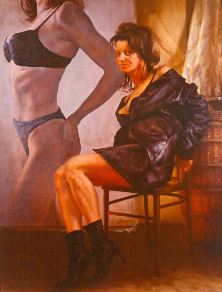 To dzieło zachwyca różnorodnością barw, dominują tu ciepłe tony, brązy i odcienie złota. Postać w centrum siedzi na krześle, z zamyśloną miną i swobodną, nieco prowokacyjną pozą. Jej skóra jest podkreślona miękkim światłem, które dodaje obrazowi głębokości i nastroju. Obok niej widoczny jest cień, który zawiera elementy kontrastu, nadając kompozycji dynamizmu. Artysta stosuje realistyczną technikę, ale jednocześnie wprowadza elementy tajemnicy. Malarskie pociągnięcia pędzla są subtelne, niemalże niewidoczne, co sugeruje opanowanie profesji. Styl obrazu przywołuje na myśl klasykę, choć można też dostrzec nowoczesne akcenty. Takie połączenie wprowadza swoisty dualizm, jakby obraz przemawiał do różnych epok naraz. Na pierwszy rzut oka dzieło może wywoływać zaskoczenie, a może nawet lekki niepokój. Ale przy dłuższym przyglądaniu się zaczyna przemawiać bardziej introspekcyjnie, zachęcając do refleksji nad samym sobą. Taka artystyczna "journey", gdzie widz zostaje wciągnięty w dialog z własnymi myślami. Patrząc na ten obraz, można poczuć, jakby czas się zatrzymał, jakby coś ważnego miało zaraz się wydarzyć. Może 7-letnie dziecko powiedziałoby, że ta pani wygląda smutno, ale może gra w jakąś zabawę. Ten obraz jest taki dramatic! Opowiada historie, które każdy może zinterpretować na swój własny sposób, angażując się w detale i emocje przedstawionej sceny.