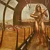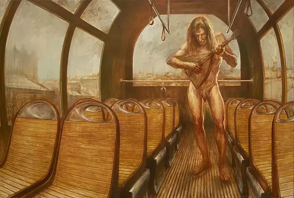 Na obrazie widać nietypową scenę: nagiego człowieka grającego na harmonii w pustym tramwaju. Kolory są ziemiste, dominuje brąz i zgaszona zieleń, co nadaje wnętrzu głęboki i stonowany wygląd. Wyraźne, zakrzywione linie drewnianych siedzeń tworzą rytmiczny układ, prowadząc wzrok w stronę postaci. Atmosfera jest jednocześnie dziwna i niepokojąca, jakbyśmy byli świadkami surrealistycznego snu lub wizji z innego wymiaru. Artysta użył realistycznej techniki malarskiej, a jednak scena emanuje abstrakcyjnym nastrojem, zacierając granice między rzeczywistością a wyobraźnią. To dzieło może wywołać całą gamę emocji - od zaskoczenia i konsternacji po śmiech lub zadumę. Czujesz się, jakbyś trafił do jakiegoś "weird" wymiaru, gdzie zasady logiki nie obowiązują. Przesłanie jest otwarte na interpretacje: może chodzi o samotność w tłumiącej rutynie codziennego życia, może o poszukiwanie swojego miejsca. A może po prostu artysta chciał, żebyśmy zastanowili się nad tym, jak postrzegamy normalność. "Dlaczego on jest goły?" - mógłby zapytać 7-latek, i to pytanie samo w sobie ma w nim coś niewinnego i szczerego. Obraz pozostawia nas z myślą, że życie jest pełne nieoczekiwanych akordów i to od nas zależy, jak je zinterpretujemy.