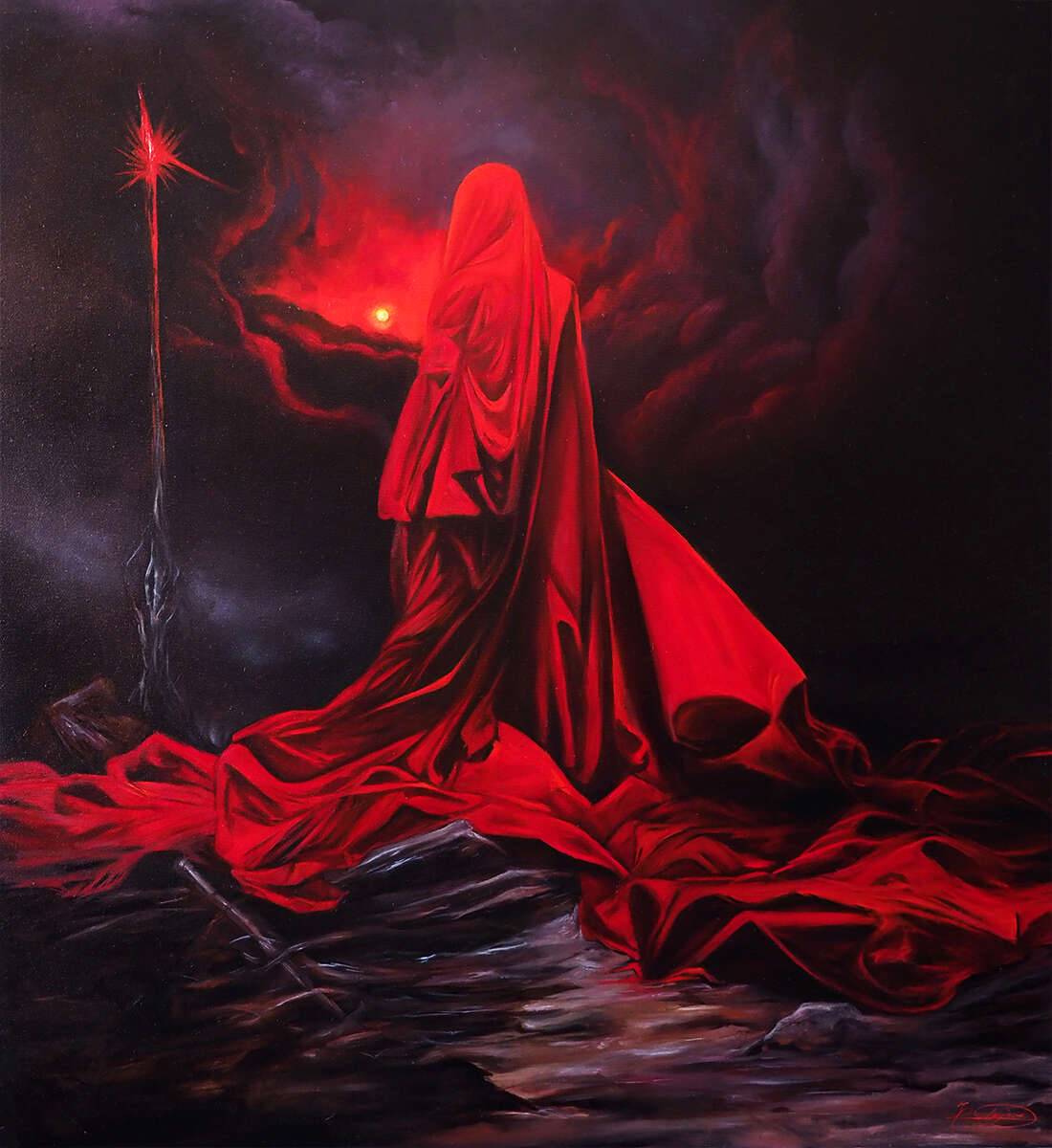 Obraz przykuwa wzrok intensywnym zestawieniem czerwieni i czerni. Centralnym elementem jest tajemnicza postać w długiej, czerwonej szacie, jakby płaszczemnocy. Czerwone draperie miękko opadają, tworząc falujące kształty, przypominające płynące fale. Tło jest mroczne, spowite ciemnymi chmurami, które kontrastują z jaskrawą czerwienią otoczenia postaci. Na horyzoncie widnieje mała, świetlista kula – może słońce, może coś magicznego. Atmosfera tego dzieła emanuje aurą tajemnicy i napięcia. Czujesz, że to moment przeddaturą, coś wielkiego zaraz się wydarzy. Artysta zastosował dramatyczne oświetlenie, które podkreśla każde załamanie materiału, dając wrażenie trójwymiarowości. Technika przypomina trochę oldschoolowy romantyzm, ale z twist. To obraz, który może wywoływać różne emocje. Może to strach przed nieznanym, a może cień nadziei, że po mroku przyjdzie jasność. "Wow, czerwony to bardzo fajny kolor!" powiedziałby 7-latek, zachwycony widokiem. Personally, I think it's mesmerizing. Czerwień zdaje się mówić o pasji i sile, podczas gdy ciemność wskazuje na niepewność. Nie jest to obraz, który zostawia cię obojętnym. Jego napięcie i złożoność sprawiają, że zatrzymujesz się na chwilę i zaczynasz myśleć o tajemnicach, jakie każdy z nas nosi w sercu. Fantastyczna gra kolorów i cieni zamienia to dzieło w prawdziwe arcydzieło.