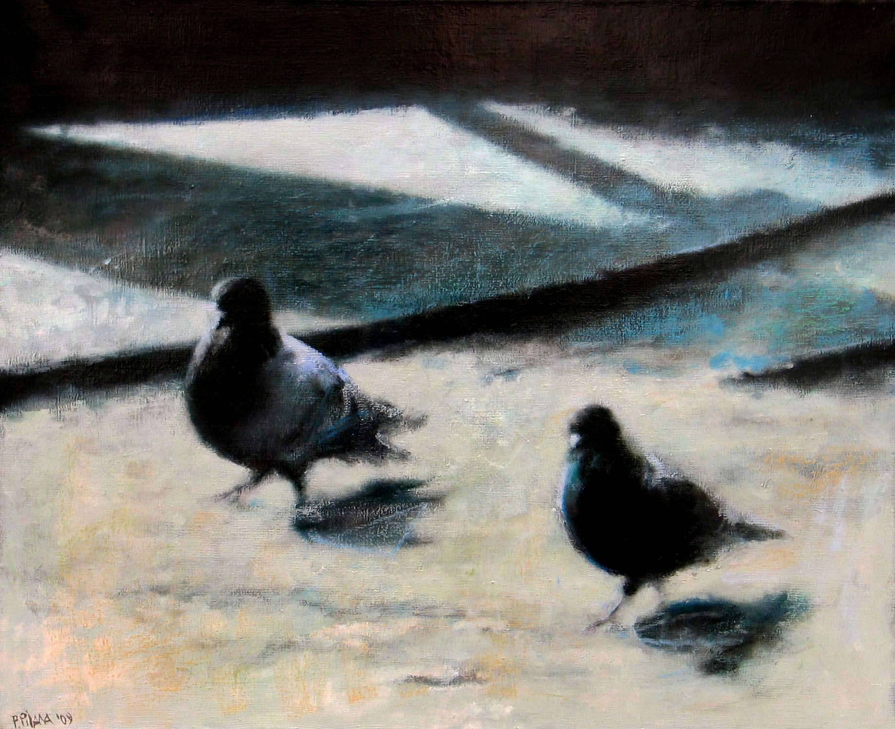 Na obrazie ukazane są dwa gołębie, które spacerują po zalanej słońcem plaży, rzucając cienie na ziemię. Dominują tutaj miękkie brązy i szarości, które kontrastują z ostrym światłem tworzącym geometryczne formy na piasku. Kompozycja jest prosta, lecz niezwykle sugestywna. Artysta uchwycił chwilę codziennego życia tych ptaków w sposób niemalże intymny. Nastrój obrazu emanuje spokojem i nostalgiczną atmosferą. Technika malarska to delikatne pociągnięcia pędzla, które nadają fakturze łagodności i naturalizmu, a "blur" w niektórych miejscach dodaje tajemniczości. Ten obraz skłania do refleksji nad prostotą chwili. Można niemal poczuć ciepło słońca i usłyszeć cichy szum morza. Patrząc na niego, zastanawiam się nad ulotnością naszego życia codziennego. To jak momenty uchwycone w biegu, które szybko mijają. Wow, ale te gołębie mają fajne cienie! Styl jest impresjonistyczny, z subtelnym użyciem światła i cienia, które balansują dzieło na granicy realizmu i abstrakcji. Wydaje mi się, że każdy może coś innego tu zobaczyć i poczuć.