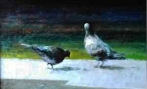 Obraz przedstawia dwa gołębie na tle miejskiego chodnika, rozmaite kształty i subtelne kolory tworzą harmonijną kompozycję. Dominują stonowane odcienie szarości i zieleni, z delikatnym oświetleniem, które sprawia, że scena wydaje się jak z innej epoki. Taka stara pocztówka. Atmosfera obrazu jest spokojna, niemal melancholijna. Przypomina chłodne, jesienne popołudnie, kiedy życie toczy się swoim rytmem, a świat zwalnia. Artist użył technik takich jak impasto, co dodaje dziełu głębi i tekstury, a także szczątkowy detal nadaje całości swoistego uroku. Obraz może wywoływać w widzu uczucie nostalgii czy zadumy nad przemijaniem codzienności. Krótko mówiąc, to jak spacer wokół placu w ciszy. Dla mnie jest to jak moment złapany na gorąco, snapshot codziennego życia, który przypomina, żeby cenić chwilę. A gołąbki zawsze są głodne, tak jak ja. Te detale, choć subtelne, zmuszają do chwili refleksji nad prostotą piękna w najzwyklejszych momentach. Nawet kiedy patrzysz, czujesz, że to "uniqueness" tej jednaj chwili.