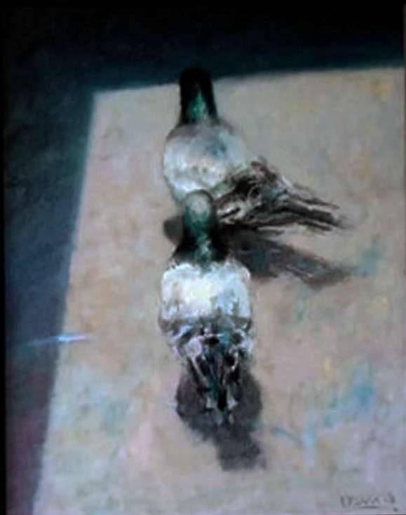 Na tym obrazie dominują stonowane barwy: różne odcienie szarości, brązu i zieleni przyciągają wzrok, tworząc poczucie spokoju i ciszy. Dwa gołębie, ustawione w linii, wyglądają jakby były zamyślone, a ich sylwetki subtelnie rzucają cienie na delikatnie oświetloną powierzchnię. Kompozycja obrazu jest prosta, ale niezwykle sugestywna, z mocnym kontrastem światła i cienia, co dodaje głębi i tajemniczości. Styl malarski jest miękki, z widocznymi pociągnięciami pędzla, które nadają temu dziełu wyraz artystycznej lekkości. Artysta używa technik, które przypominają impresjonizm – kolory są mieszane i rozpraszane, by uzyskać efekt delikatnego migotania. Dzieci mogłyby powiedzieć: "Te ptaszki są bardzo ciche!". Obraz może wywoływać refleksję nad codziennością i prostotą życia, przypominając nam o magii chwili. Całość emanuje nostalgicznym nastrojem – it's like time has paused. Może skłaniać do zatrzymania się i odkrycia szczegółów wokół nas.