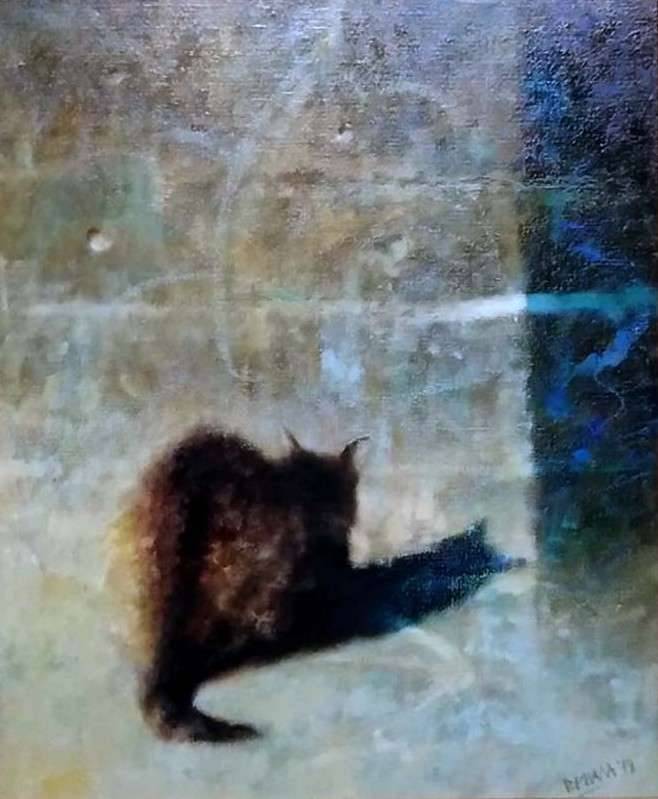 Obraz ukazuje samotnego kota, który siedzi na tle ściany o ciekawej fakturze. Tło jest stonowane, utrzymane w szaro-zielonych odcieniach, które przypominają nieco teksturę starego muru. Kot siedzi tyłem, a jego czarna sylwetka wydaje się miękka, niemalże jakby była zamazana, co dodaje całości tajemniczego nastroju. Cień kota, rzucany na ścianę, jest bardziej wyrazisty, niemalże jak realistyczna postać kontrastująca z rozmytym futrem. Atmosfera obrazu jest nieco melancholijna, prawie medytacyjna. Wydaje się, że artysta celowo użył subtelnych, stonowanych barw, by podkreślić spokój i ciszę chwili. No, może troszkę dramatyzmu, ale pozytywnego. Można tu dostrzec technikę impresjonistyczną, z naciskiem na uchwycenie ulotnego momentu za pomocą łagodnych pociągnięć pędzla. Obraz budzi w odbiorcy uczucie zadumy i refleksji nad ulotnością chwili. Może wywoływać skojarzenia z samotnością, ale także z wolnością i autonomią, jakie często przypisujemy kotom. W kontekście stylu pisania, dzieło staje się prawdziwym "eye-opener", zmuszającym do zastanowienia się nad tym, co właśnie przeżywamy i dostrzegamy na co dzień. A kotek wygląda tak, jak kotek wyglądać powinien. To fajne, że zwierzak wydaje się być częścią większej całości, może jakiegoś snu albo marzenia.