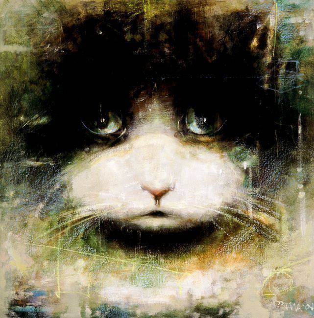 Na obrazie widzimy tajemnicze kocie oblicze, które wyłania się z migotliwej mgły kolorów. Dominują tu odcienie zieleni, brązu i bieli, tworząc niemal surrealistyczną kompozycję. Kształty są rozmyte, a technika artysty zdaje się łączyć impresjonizm z delikatnym surrealizmem. To takie artsy! Atmosfera jest pełna tajemnicy i nostalgii. W kocich oczach można dostrzec nutę melancholii – zdają się opowiadać historię, która wywołuje u patrzącego emocje z głębi serca. Patrząc na to, można poczuć się jak w innym świecie. Artysta używa dynamicznych pociągnięć pędzla, tworząc niejednoznaczny, niemal eteryczny efekt. Obraz działa na wyobraźnię, skłaniając do refleksji nad delikatnością natury i ulotnością chwili. Mały widz mógłby powiedzieć: "Ten kot wygląda, jakby miał swoje secret". Wzruszenie miesza się tu z poczuciem spokoju, a obraz może spokojnie opowiadać każdemu swoją własną historię, ukrytą w miękkiej mieszaninie barw.