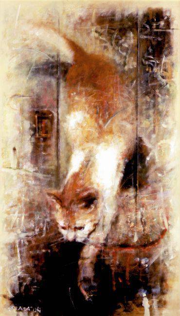 Na obrazie widzimy kota, który wydaje się być w ruchu. Odcienie brązu, beżu i delikatnej bieli tworzą miękką, rozmytą kompozycję. Ta kolorystyka nadaje obrazowi ciepłą, nieco nostalgiczną atmosferę. W tle można dostrzec subtelne smugi i wzory, których forma jest niejednoznaczna, co dodaje tajemniczości. Kot jest centralnym punktem dzieła, jego sylwetka jest wyraźna na rozmytym tle. Wygląda, jakby się poruszał, może spacerował, szukał czegoś, próbował sięgnąć miejsca poza ramą obrazu. Artysta zastosował technikę impastową, gdzie farba jest nałożona grubą warstwą, co dodaje tekstury i głębi. Styl przypomina impressionizm z nutą modernizmu. W dotyku obraz mógłby być szorstki, ale jednocześnie bardzo sugestywny. Ta dynamika pociągnięć pędzla wciąga widza, zmuszając do zatrzymania się na chwilę. Emocje, które wzbudza obraz, są mieszane. Może wywoływać uczucie spokoju, ale też lekkiego niepokoju. Patrząc na kota, można poczuć się jak w opowieści, gdzie coś się dzieje za kulisami. Taki obraz, choć prosty, niesie ze sobą głębię. Dla 7-letniego dziecka, to po prostu „kotek, który idzie w tajemnicy”. Dla dorosłych może być to symbol ruchu ku nieznanemu. To misterne touch sprawia, że obraz wydaje się niemal żywy. Autentyczność emanuje z każdej plamy farby. Obraz jest jak okno do innego wymiaru, gdzie czas płynie inaczej, wolniej. Patrząc na niego, można się zastanowić, dokąd zmierza kot? Czy goni swoją własną opowieść? Budzi to refleksję nad tym, jak my sami przemierzamy nasze ścieżki życia.