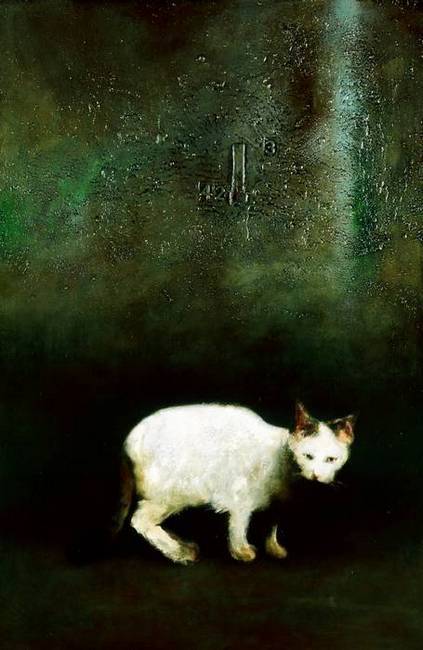 Obraz przedstawia kota na tle tajemniczego, ciemnego muru, co tworzy atmosferę niepewności i napięcia. Kolory są stonowane, dominują odcienie zieleni i szarości, a kot mieni się bielą w centrum, co przyciąga wzrok. Kompozycja jest raczej minimalistyczna, skupiona na jednym bohaterze, co potęguje wrażenie opuszczenia. Nastrój? Trochę jak z filmu noir, pełen tajemnicy i niedopowiedzeń. Artysta zastosował techniki olejne, co daje wrażenie głębi i złożoności faktury. Można prawie poczuć szorstkość ściany i miękkość futra kota. Obraz budzi emocje - trochę smutku, trochę ciekawości. Czemu kot tu jest i co może symbolizować? Może samotność, a może to po prostu moment złapany w czasie. Taki kot mógłby szukać przygód albo tylko sobie leniuchować. Mamo, a czemu ten kot jest sam? Jego twarz pełna jest spokoju, a jednocześnie zdaje się nas gnębić pytaniami. To połączenie between artystycznej wrażliwości a surowości tworzy nieoczywistą całość. Każdy krok kota to krok w nieznane, w świat marzeń, z którego nie chce się wracać.