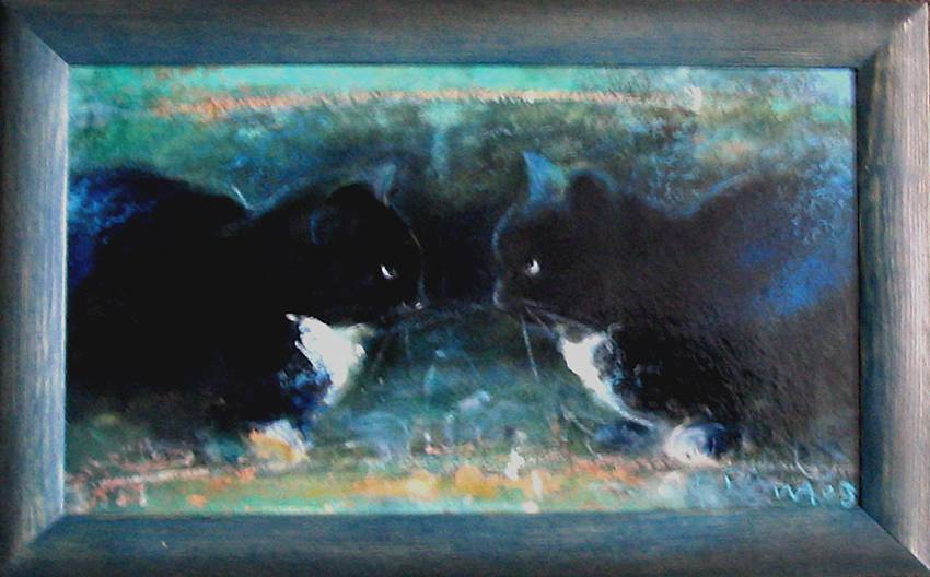 Na obrazie widzimy dwa czarne koty, które patrzą na siebie w lustrze. Tło mieni się głębokimi odcieniami zieleni i niebieskiego, a choć nie jest intensywne, dodaje tajemniczego uroku. Sylwetki kotów są delikatnie rozmyte, co tworzy aurę niedopowiedzenia. Obraz emanuje spokojem, a może nawet nutą melancholii. Artysta zastosował subtelną grę światła i cienia, aby wydobyć kontrast między ciemnymi ciałkami kotów a jaśniejszym otoczeniem. Widz może poczuć ciepło i ciszę, jakie towarzyszą wieczornej kontemplacji. W stylu artystycznym można dostrzec impresjonistyczne podejście do barwy i formy, które wzmacniają emocjonalny przekaz dzieła. Obraz "jest magiczny, jak w bajce", powiedziałoby z pewnością dziecko. Wywołuje uczucia spokojnego zadumania i refleksji nad pięknem prostych chwil. W końcu, coś w tym obrazie jakby mówiło "hello" do nas, przypominając, że każdy z nas ma swoje tajemnice. Oglądając to dzieło, można zanurzyć się w świat wyobraźni, gdzie koty stają się symbolami czegoś niewyrażalnego słowami.